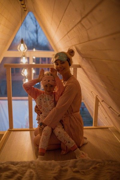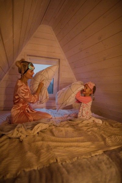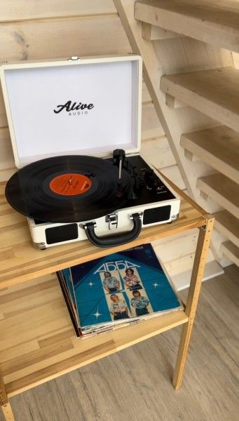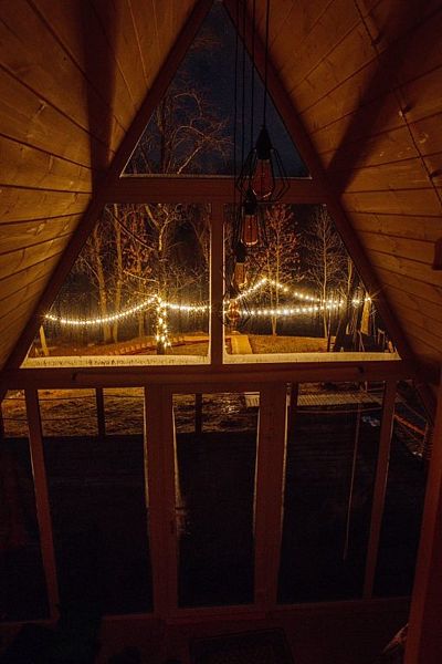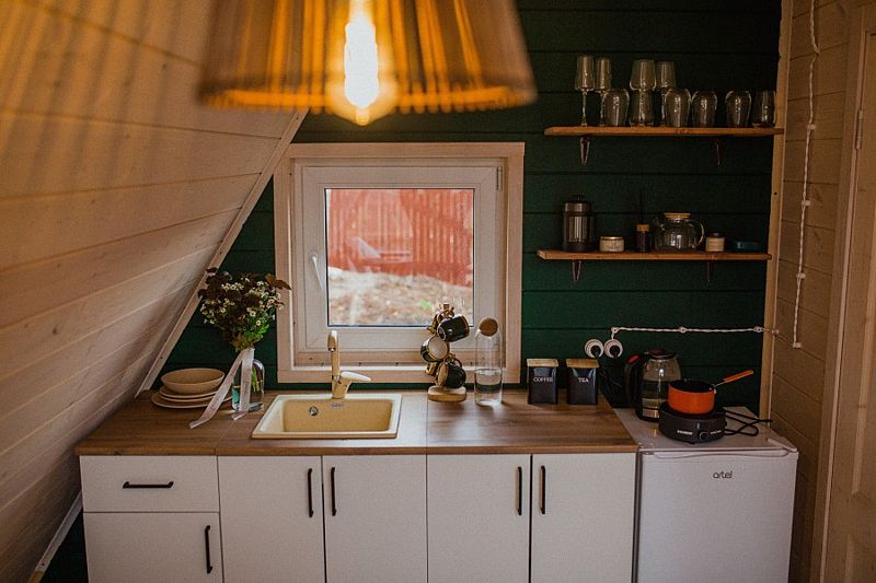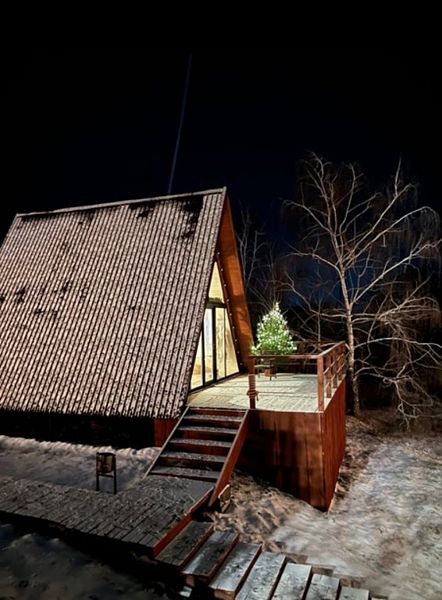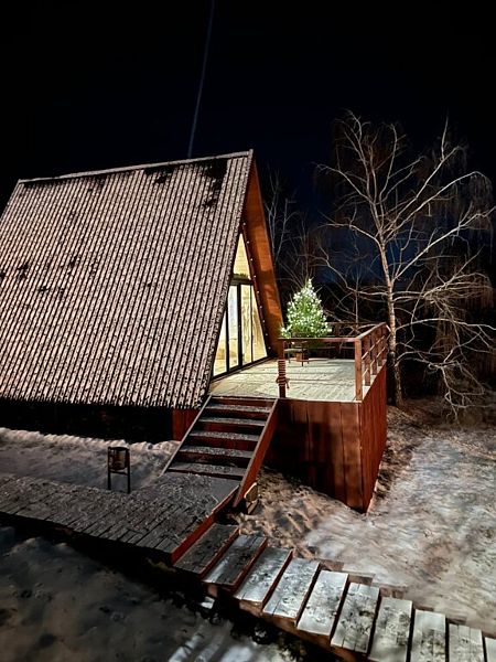 Уютный A-frame поражает гостей панорамным остеклением с видом на реку и лес. Главное очарование домика — второй ярус, засыпать и просыпаться там — сказка! Красоту и комфорт отдыха в глэмпинге подчёркивает виниловый проигрыватель с коллекцией пластинок и кинопроектор для вечернего просмотра фильмов.