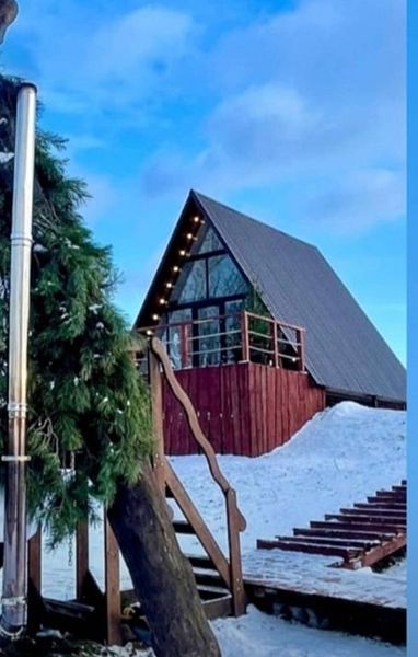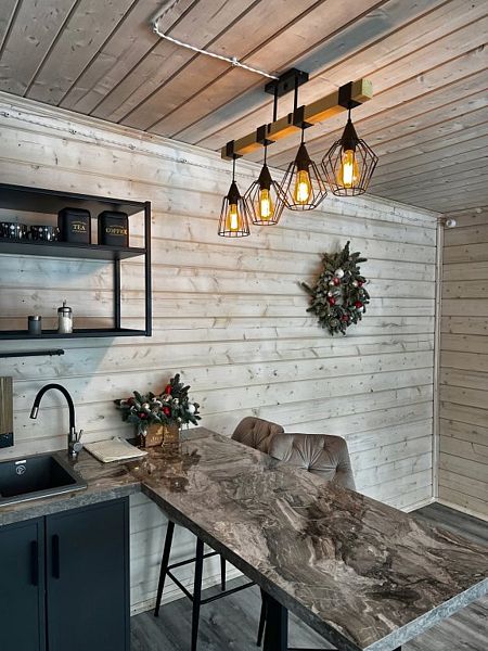 Особенный, очень стильный видовой домик с большой террасой. Три панорамных окна, уютная спальня и просторная студия. Стиль и комфорт в сочетании с потрясающей природой.
