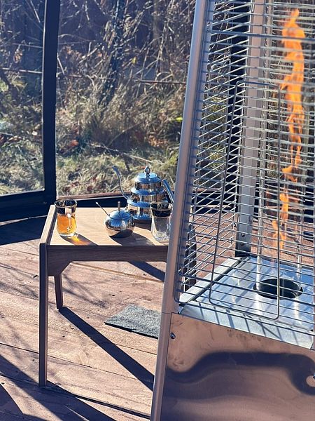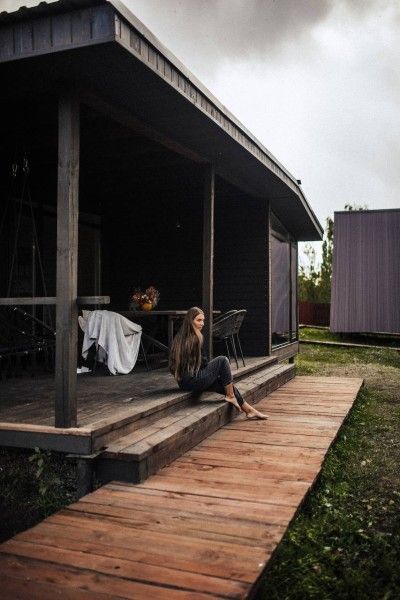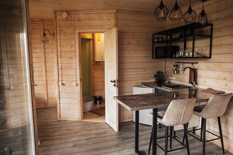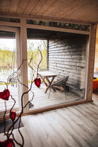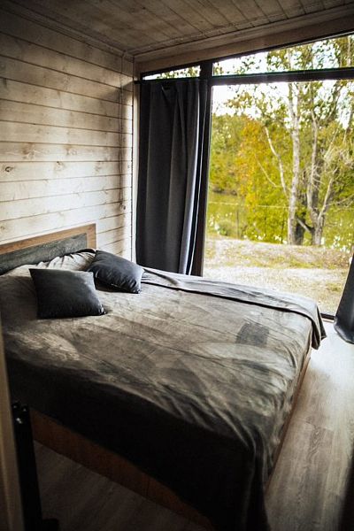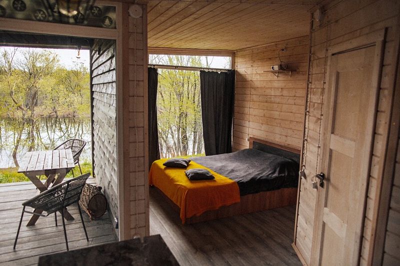 Уютный дом с панорамным остеклением и наилучшим видом на реку, лес и территорию глэмпинга. Домик является большой студией с зоной кухни — пространством для отдыха и спальней. Над кроватью расположен кинопроектор, благодаря которому гости проводят вечера за просмотром фильмов, лежа в мягкой кровати. У гостей этого дома также своя крытая терраса для утреннего кофе.