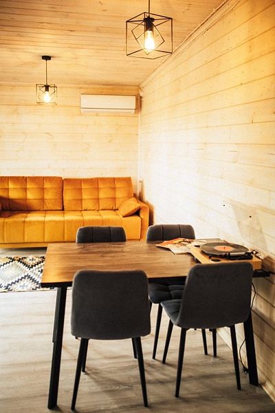 В стоимость аренды дома входит: мангальная зона (угли, розжиг, решетка и шампура входят в стоимость), собственная терраса у дома, виниловый проигрыватель с коллекцией пластинок, проектор и экран с кинотекой семейных фильмов, общая костровая зона для посиделок в кресле с чаем, просторная гостиная с уютным диваном, который становится дополнительным спальным местом.