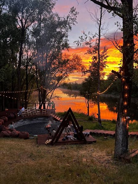 Прогулки по множеству деревянных дорожек, ведущих к живописной реке и уютной костровой зоне, наполняют душу спокойствием и умиротворением. На берегу реки вечерами разжигается большой костер, вокруг которого собираются гости, чтобы наблюдать, как солнце плавно опускается за горизонт, и наслаждаться мелодичными звуками гитары.