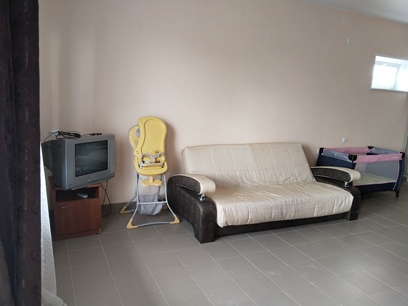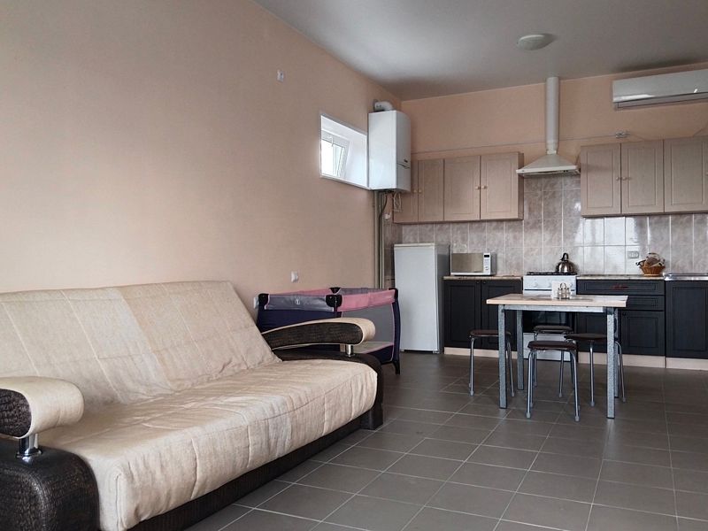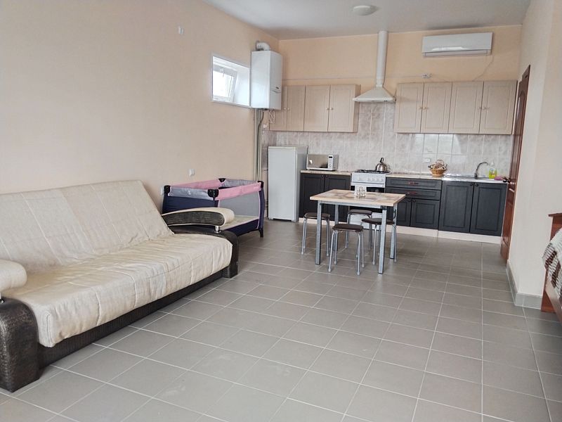 Гостевой дом рассчитан на размещение до 4 человек, создавая все условия для комфортного проживания. Жилое пространство включает в себя оборудованную кухню с обеденной зоной, оснащенную столом и стульями для трапез. Гости могут расположиться для отдыха на удобной двуспальной кровати или раскладном диване. Для семей с детьми предусмотрены детская кроватка и стульчик для кормления.