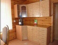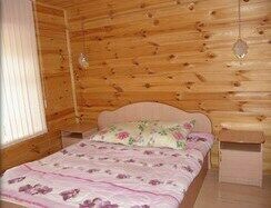 Внутренняя отделка: срубовое дерево в приятных спокойных тонах. Домик состоит из спальни, кухни-столовой оборудованной кухонной мебелью и всем необходимым, комнатой отдыха на втором этаже.
