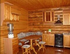 Внутренняя отделка: срубовое дерево в приятных спокойных тонах. Домик состоит из спальни, кухни-столовой, оборудованной кухонной мебелью и всем необходимым, комнатой отдыха на втором этаже.
