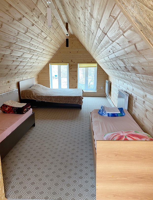 - 2 этаж: комната (двухспальная и две односпальные) кровати, туалет.