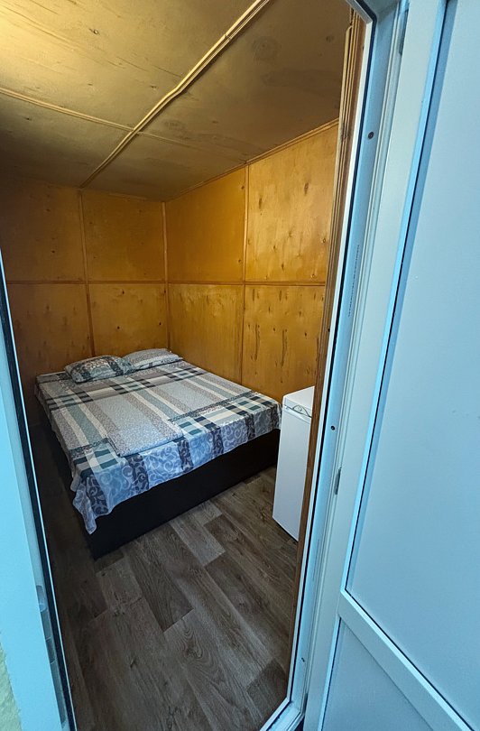 Отдельностоящий дом 2. Вместимость 4 человек. В доме имеется раковина, но удобства и душ находятся на территории турбазы. В доме 2 комнаты (в одной 2х спальная кровать, в другой двухместный диван). Также есть холодильник, микроволновка, термопот и сервировочная посуда. Для отдыха на природе возле домика стол и лавки.