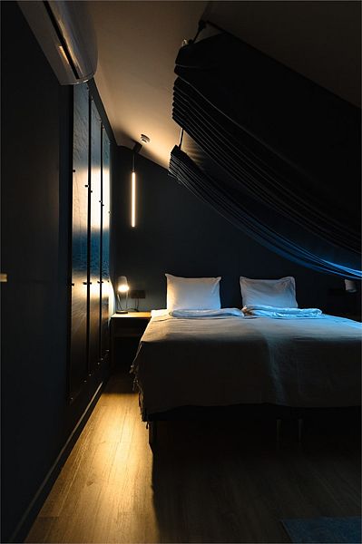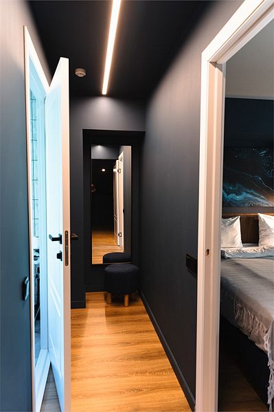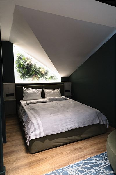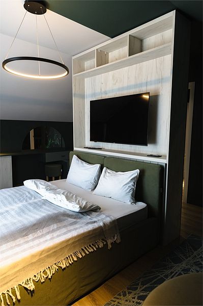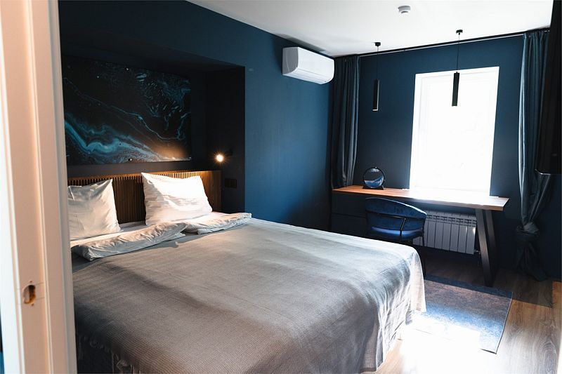 Двухкомнатный комфортабельный номер с современной отделкой. В гостиной есть диван, телевизор, мини-холодильник, чайник, набор посуды. В спальне расположена двуспальная кровать и прикроватные столики, шкаф/рейл для одежды. Совместный санузел с душевой кабиной и набором гигиенических принадлежностей. В номере №11 не предусматривается размещение с животными.