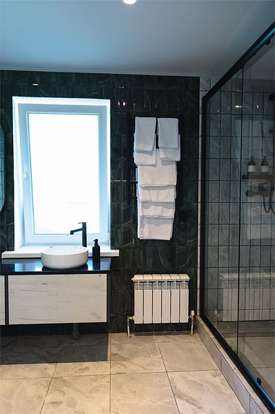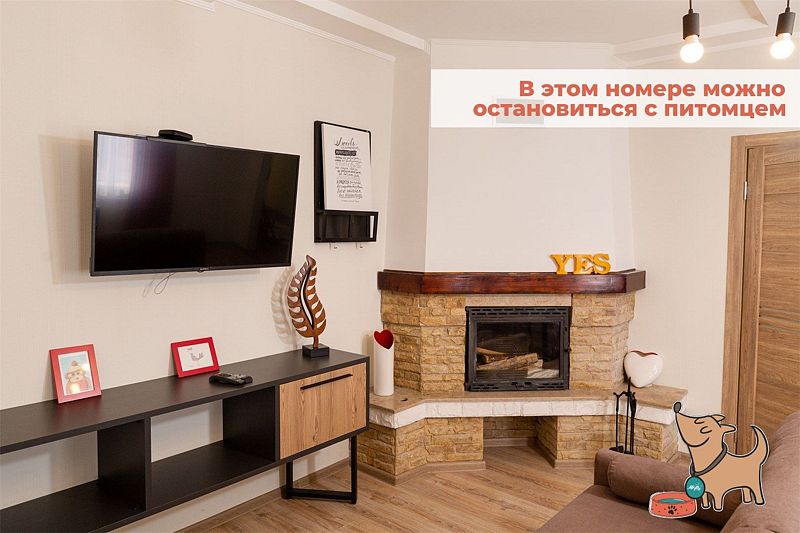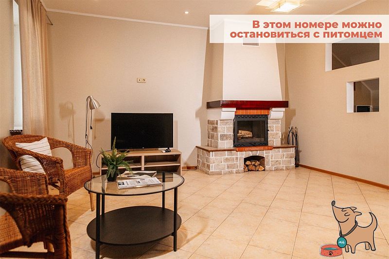 Двухкомнатный комфортабельный номер с современной отделкой. В гостиной есть диван, телевизор, мини-холодильник, чайник, набор посуды. В спальне расположена двуспальная кровать и прикроватные столики, шкаф/рейл для одежды. Совместный санузел с душевой кабиной и набором гигиенических принадлежностей. В номере №9 возможно размещение с животными высотой в холке до 35 см.