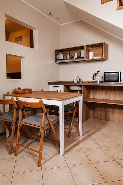 Двухкомнатный комфортабельный номер с современной отделкой. В гостиной есть диван, телевизор, мини-холодильник, чайник, набор посуды. В спальне расположена двуспальная кровать и прикроватные столики, шкаф/рейл для одежды. Совместный санузел с душевой кабиной и набором гигиенических принадлежностей. В номере №12 не предусматривается размещение с животными.