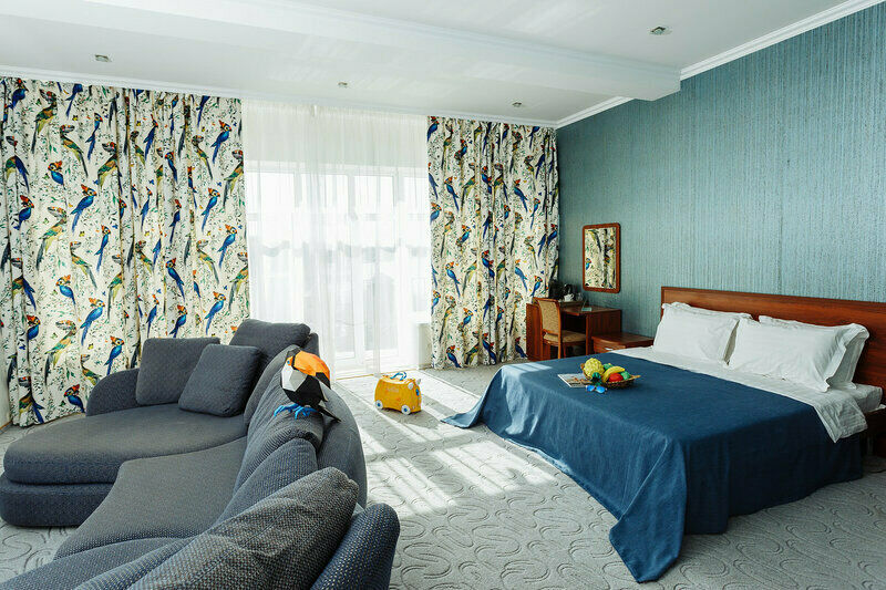 Двуспальная кровать, холодильник, ТВ, кондиционер, Wi-fi, фен, двуспальный диван, халат, тапочки, room-service с 5.00 до 23.00, сейф, шкаф купе, санузел, джакузи, средства гигиены.