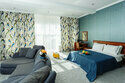 Двуспальная кровать, холодильник, ТВ, кондиционер, Wi-fi, фен, двуспальный диван, халат, тапочки, сейф, шкаф купе, санузел, ванна, средства гигиены.
