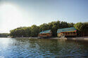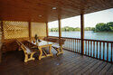 Двухэтажный сруб на 10-15 человек. На первом этаже баня, душ, туалет, комната отдыха с двуспальным диваном, ТВ, кондиционер, кухня с микроволновой печью, холодильником, посудой, чайником. На втором этаже две спальни и дополнительное спальное место, кондиционер. Площадка с мангалом, большая веранда на воде.