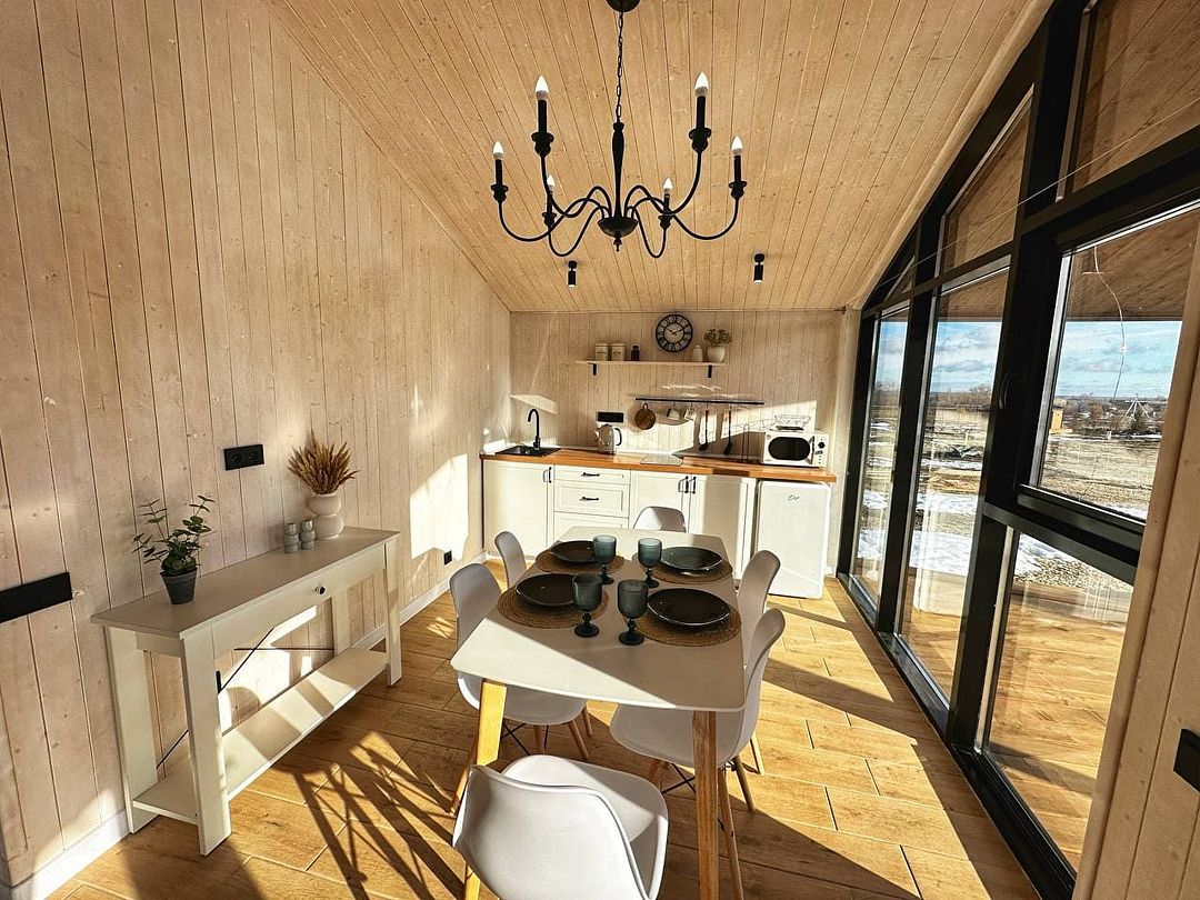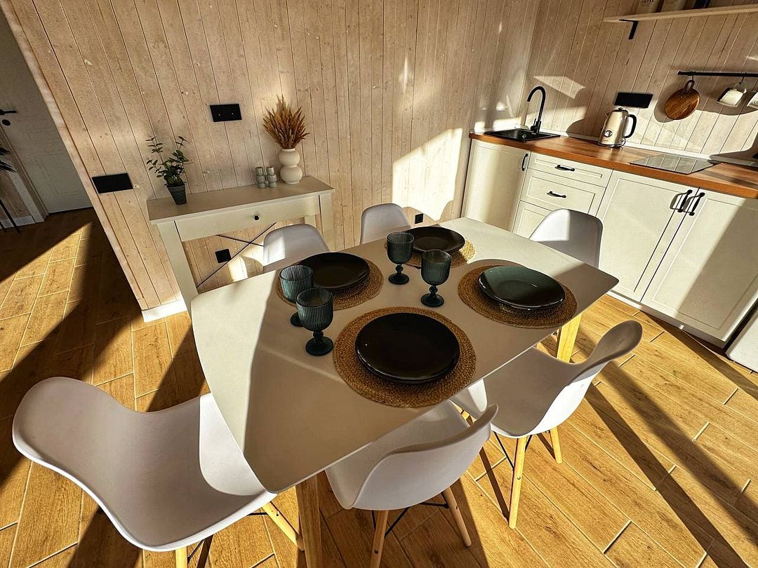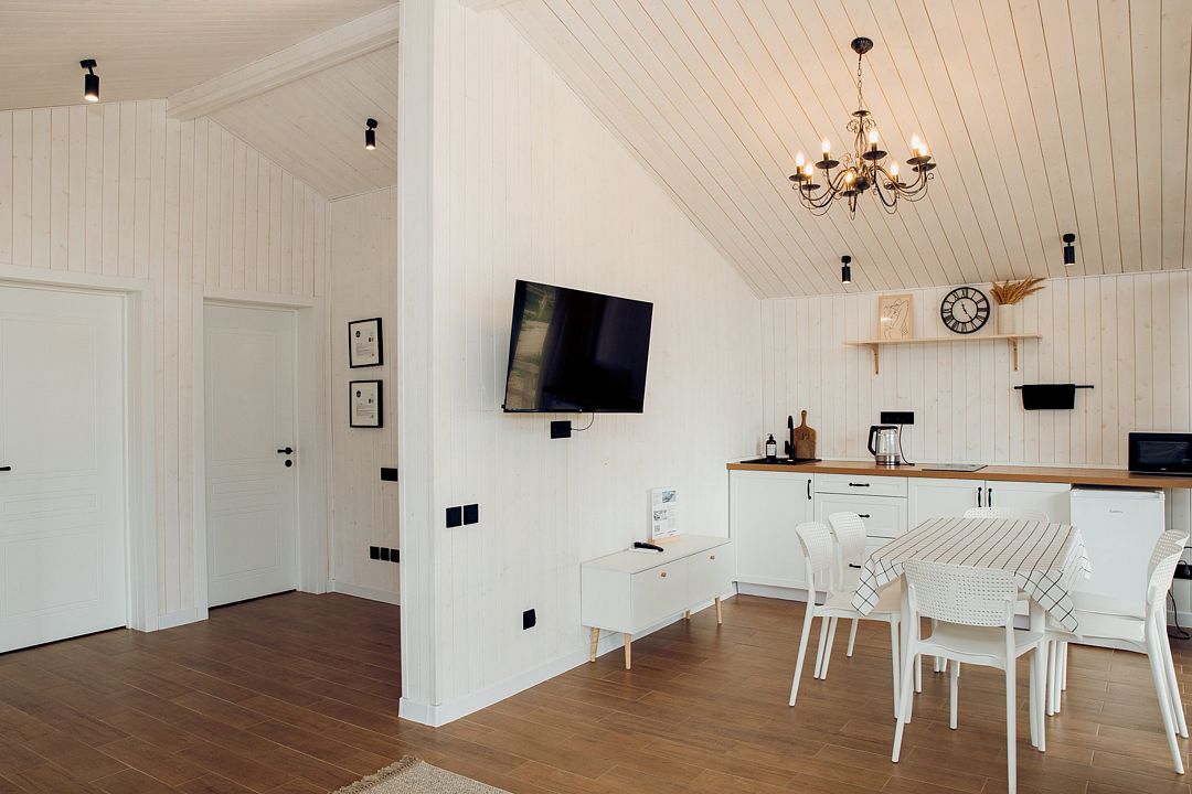 Это комфортный одноэтажный домик, в котором есть всё необходимое для комфортного отдыха: полностью оборудованная кухня, необходимая бытовая техника и посуда, светлая гостиная, уютные спальни, телевизор и удобная мебель.