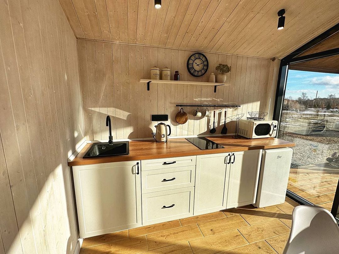 - полностью оборудованная кухня (микроволновая печь, электрический чайник, плита);