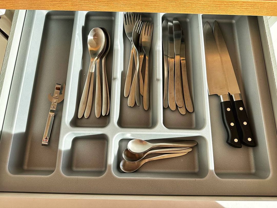 - набор посуды на 6 человек (тарелки, кружки для чая, бокалы, ложки, вилки и ножи);
