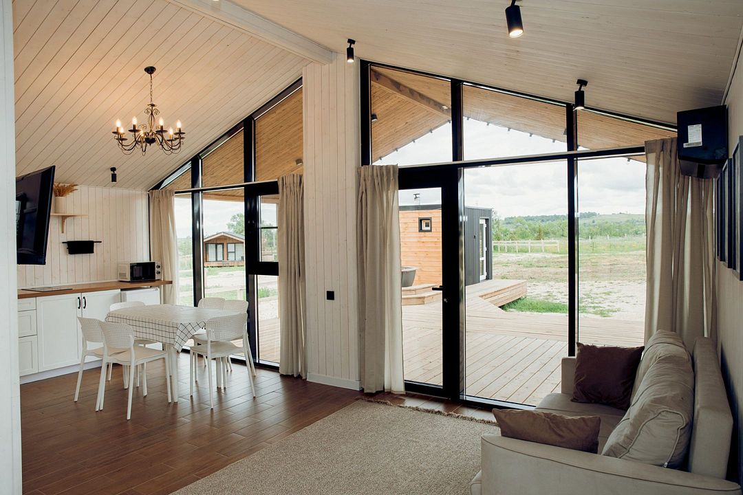 Из панорамных окон вы будете наблюдать невероятные виды на горы, как зимой, так и летом. Так же вы сможете полюбоваться потрясающим видом на Волгу, выбрав двухэтажный коттедж для размещения, или прогуляться пешком до реки, ведь здесь восхитительный воздух.