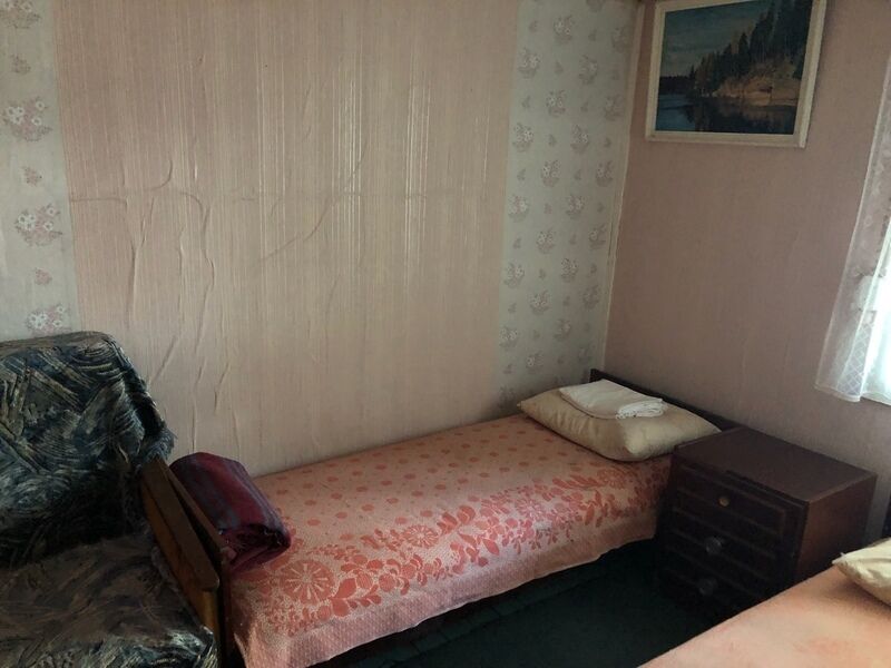 Отдельно стоящий домик площадью 12 кв.м.(3 домика). В домике: холодильник, чайник, четыре односпальные кровати, постельные принадлежности, стол, стулья, вешалка, обогреватель.