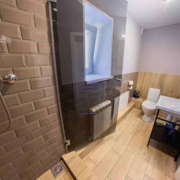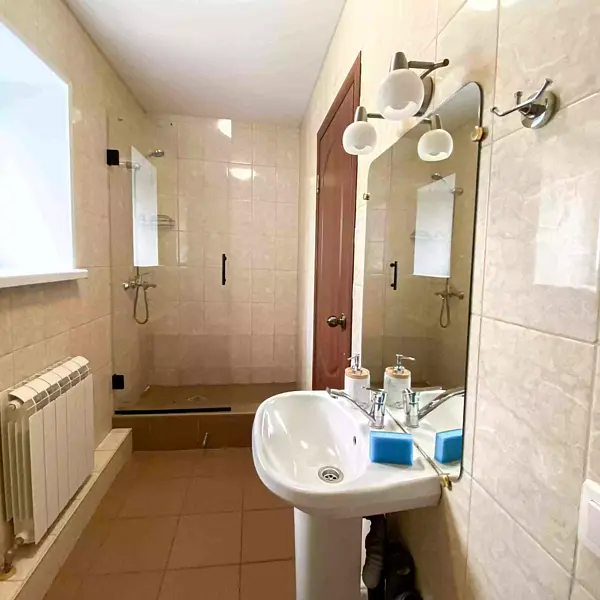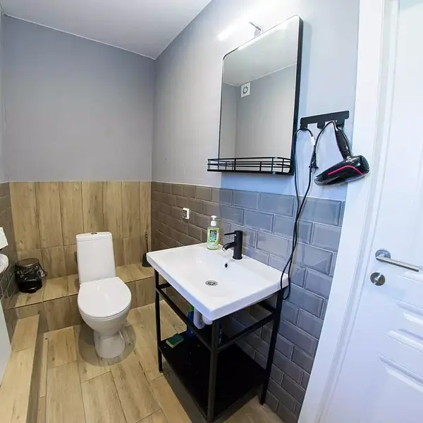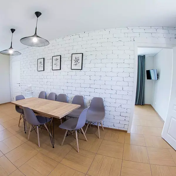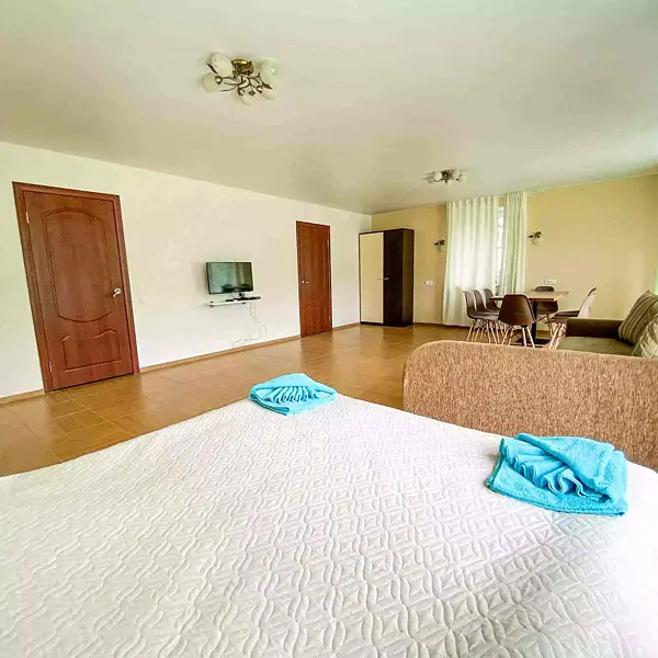 - 1 комната: большая двуспальная кровать, двуспальный диван, стол со стульями, телевизор, платяной шкаф;