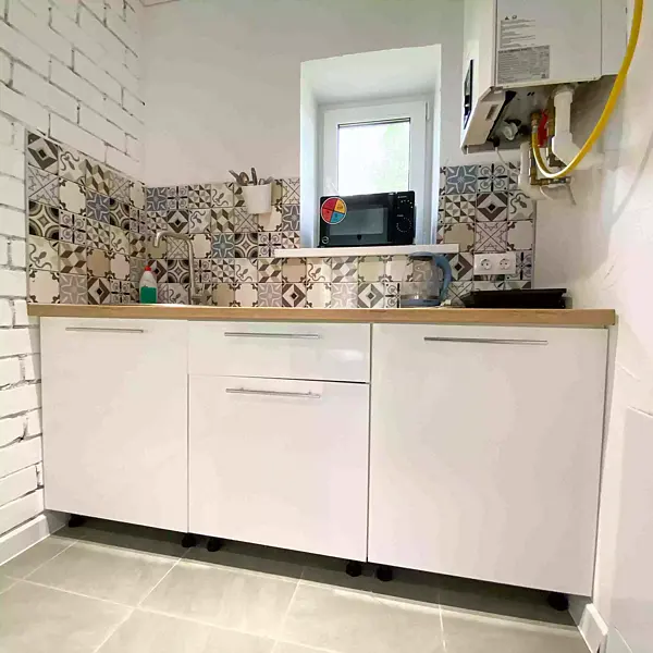 - на небольшой кухне есть все необходимое: плита, микроволновка, холодильник, чайник, набор посуды, (тарелки, ложки, вилки, стаканы);