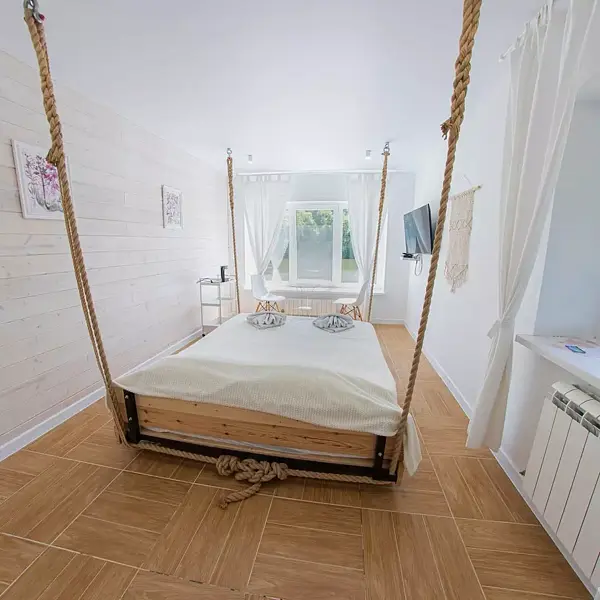 - большая двуспальная кровать-качели с подсветкой, столик со стульями, телевизор, стеллаж;