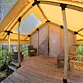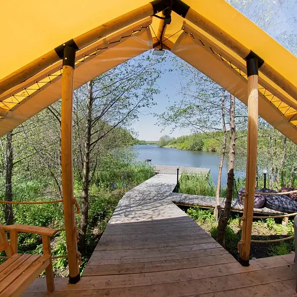 Глэмпинг расположен на полуострове, куда можно добраться по мостику или водным транспортом.