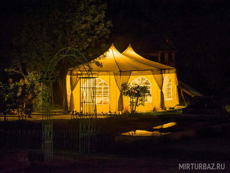 Белый шатер - центральное место отдыха Усадьбы "Сказка", расположен на поляне Дружбы. Рядом - игровые площадки, детский домик с горкой, зона отдыха с каскадным бассейном и гравийным садом. За шатром расположено крытое место для приготовления шашлыков, барбекю, плова, умывальник с большой столешницей, электрокоммуникации. Способен разместить компанию до 40 человек. Отличное место для проведения любых мероприятий: торжеств, свадеб, юбилеев, корпоративных встреч, детских праздников, игровых программ.