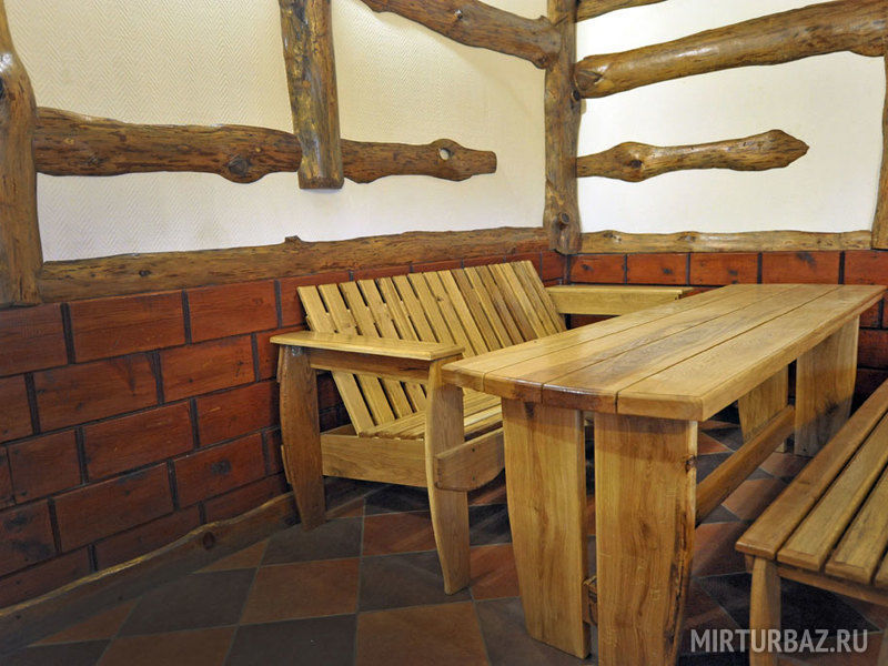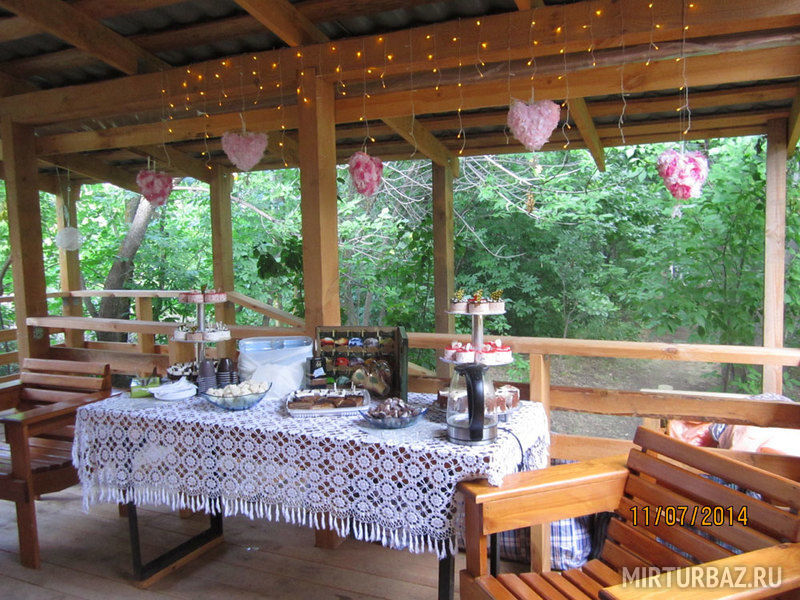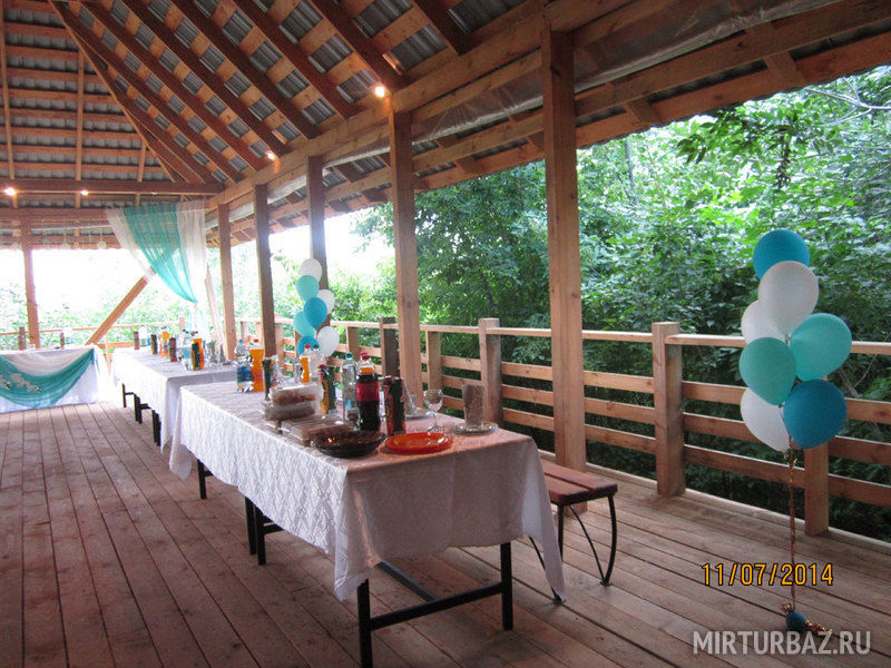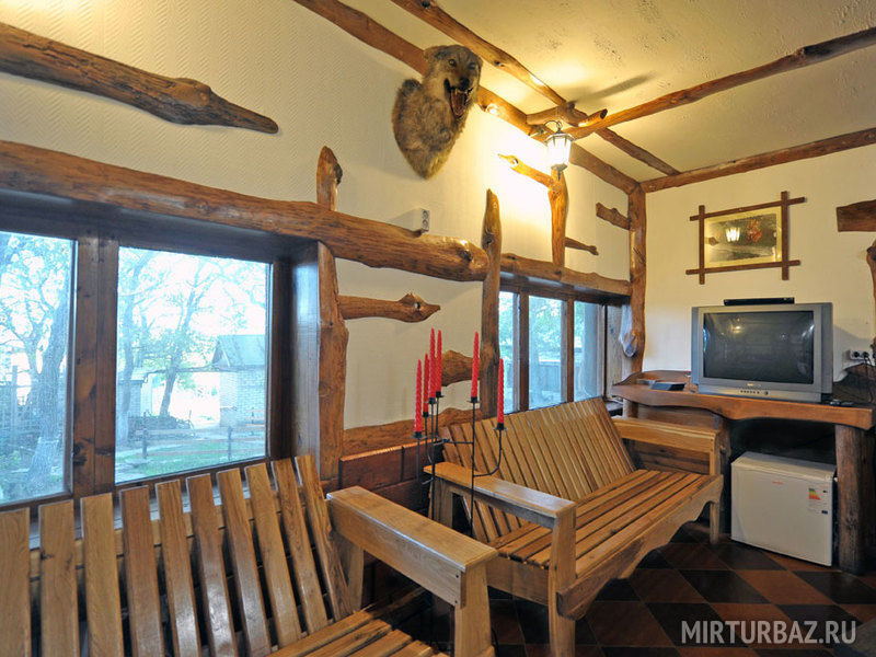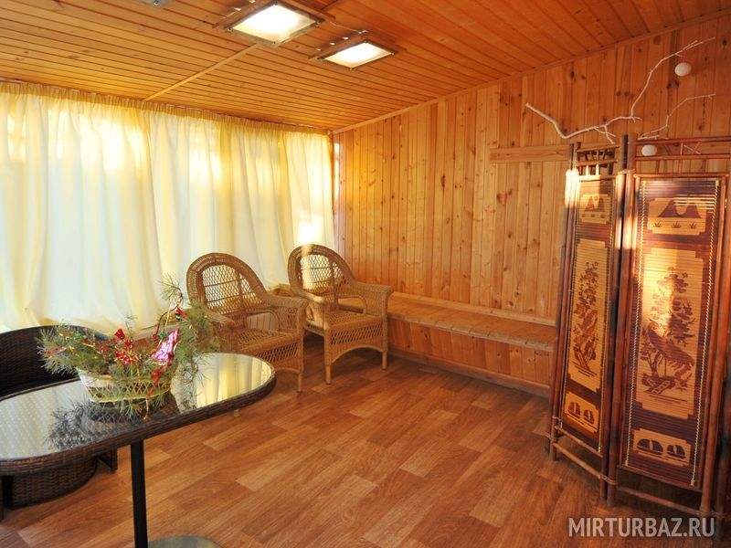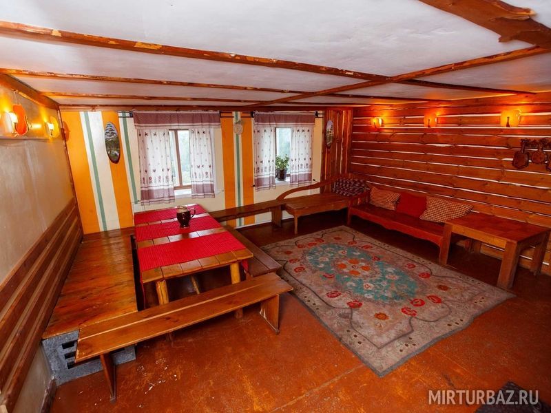 В большой гостиной "Сказки" легко разместится компания до 30 человек, удобная деревянная мебель, интерьер в "охотничьем" стиле, санузел в помещении. Площадка рядом с гостиной позволяет перенести действие на свежий воздух и значительно увеличить количество гостей. Широкие столы, скамьи, деревянные кресла, большой мангал, качели, место для танцев (выступлений, презентаций и т.п.) Деревья и кустарники создают тень, даже в жару здесь комфортно. Это место отдыха находится в дали от коттеджей и игровых площадок, идеально для большой компании.