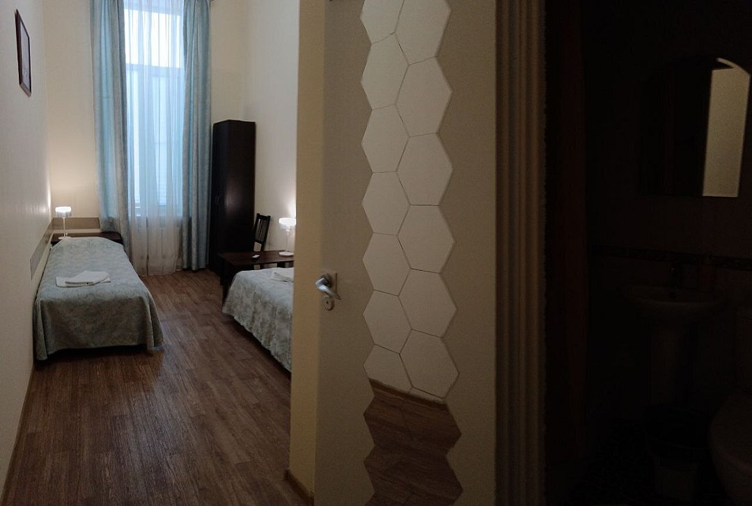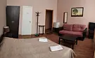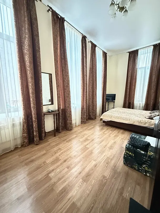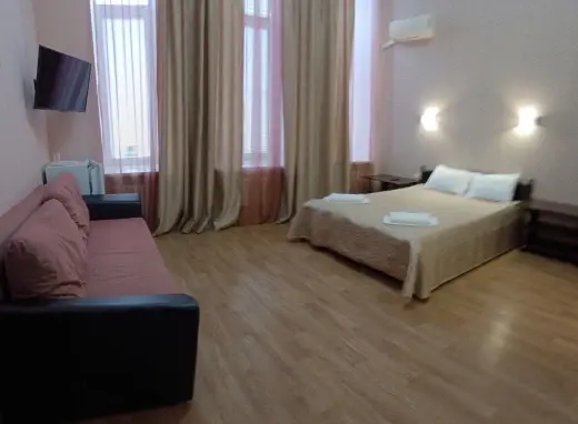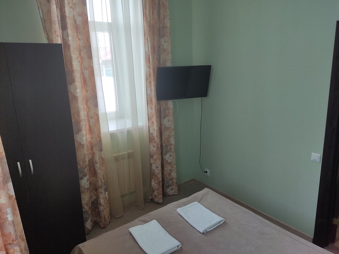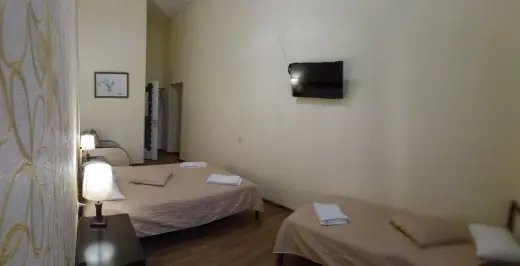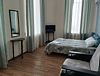 В номере 3-4 окна высотой 3 метра; кондиционер, высота потолка 4.5 м, прикроватные тумбочки, стул, телевизор с подключеными цифровыми каналами, шкаф для одежды; консольный столик, на полу линолеум; ванная комната с душевой и санузлом, полотенца, саше с шампунем, тапочки, фен.