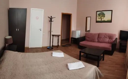В одной части двуспальная кровать, тумбы прикроватные, светильники, большой шкаф-купе, кондиционер. Во второй части 2 двуспальных дивана, журнальный столик, холодильник светильники. Санузел с душем, раковиной, унитазом, феном. Номер укомплектован тапочками, зубными наборами, саше с шампунем и туба с жидким малом. Полотенца 2 маленьких и 2 больших. Дополнительные места комплектуются большими полотенцами. Между зонами большой стол с барными стульями.