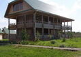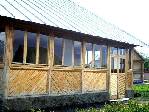 Представляет из себя трехэтажный бревенчатый дом с открытой верандой, открытыми балконами на втором этаже и закрытыми лоджиями на третьем.