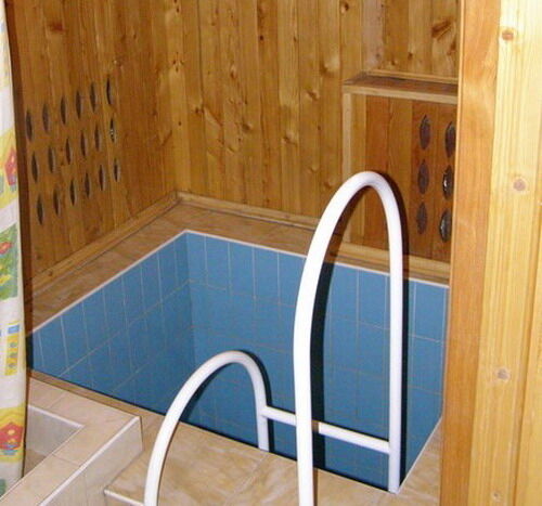 В домике: две односпальные кровати, холодильник телевизор, санузел. Душ в бане или возле бассейна.