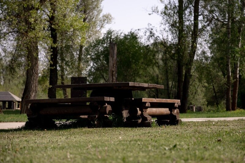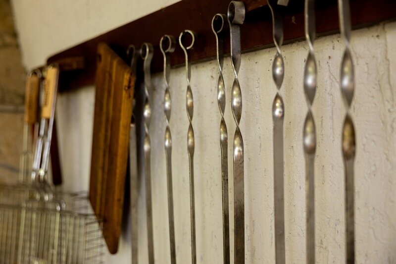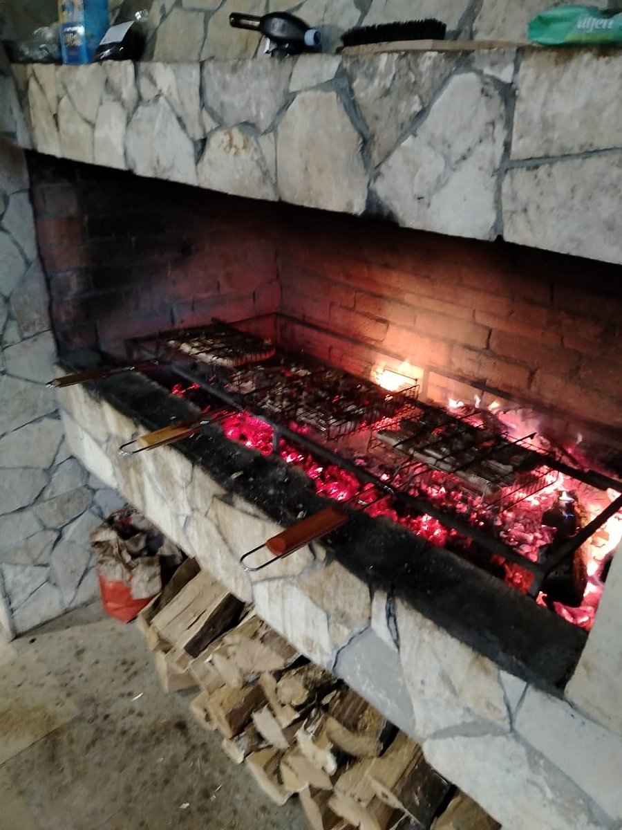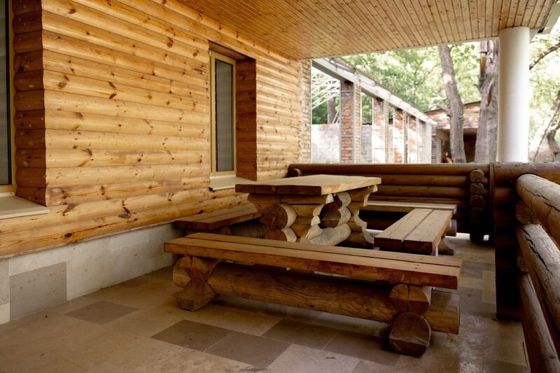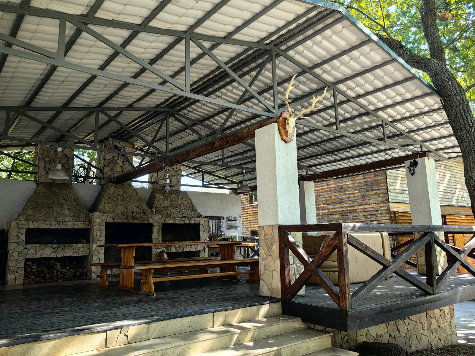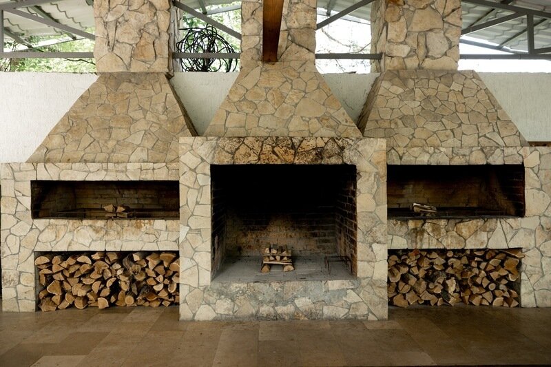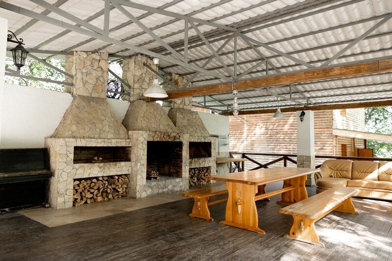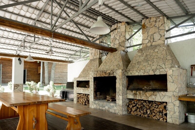 В стоимость входит: два мангала, камин, площадка для приготовления в казане, большой обеденный стол