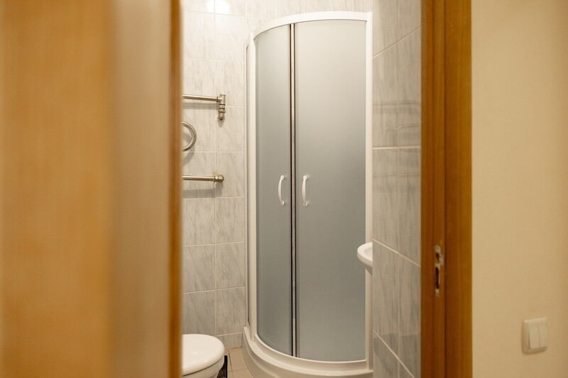 В домике: 2 комнаты, тумбочки, шкаф, душ, раковина, туалет.