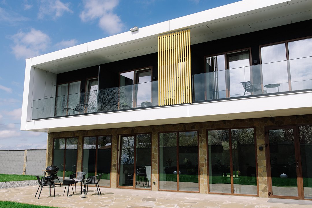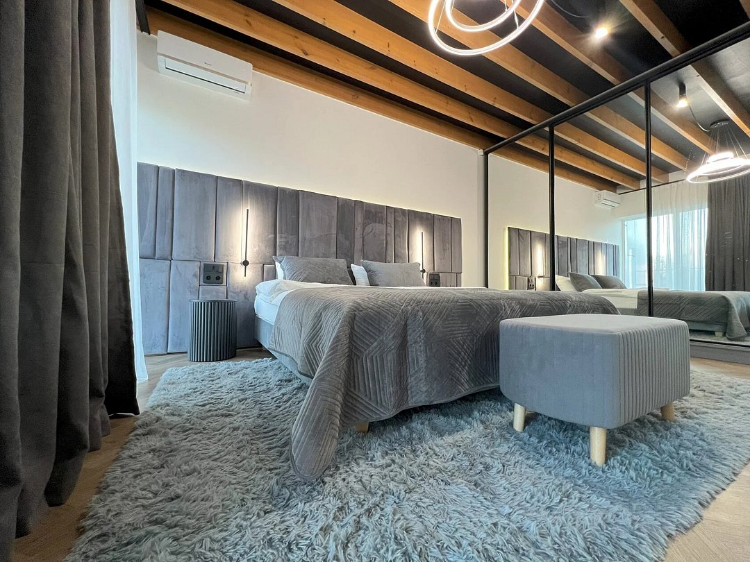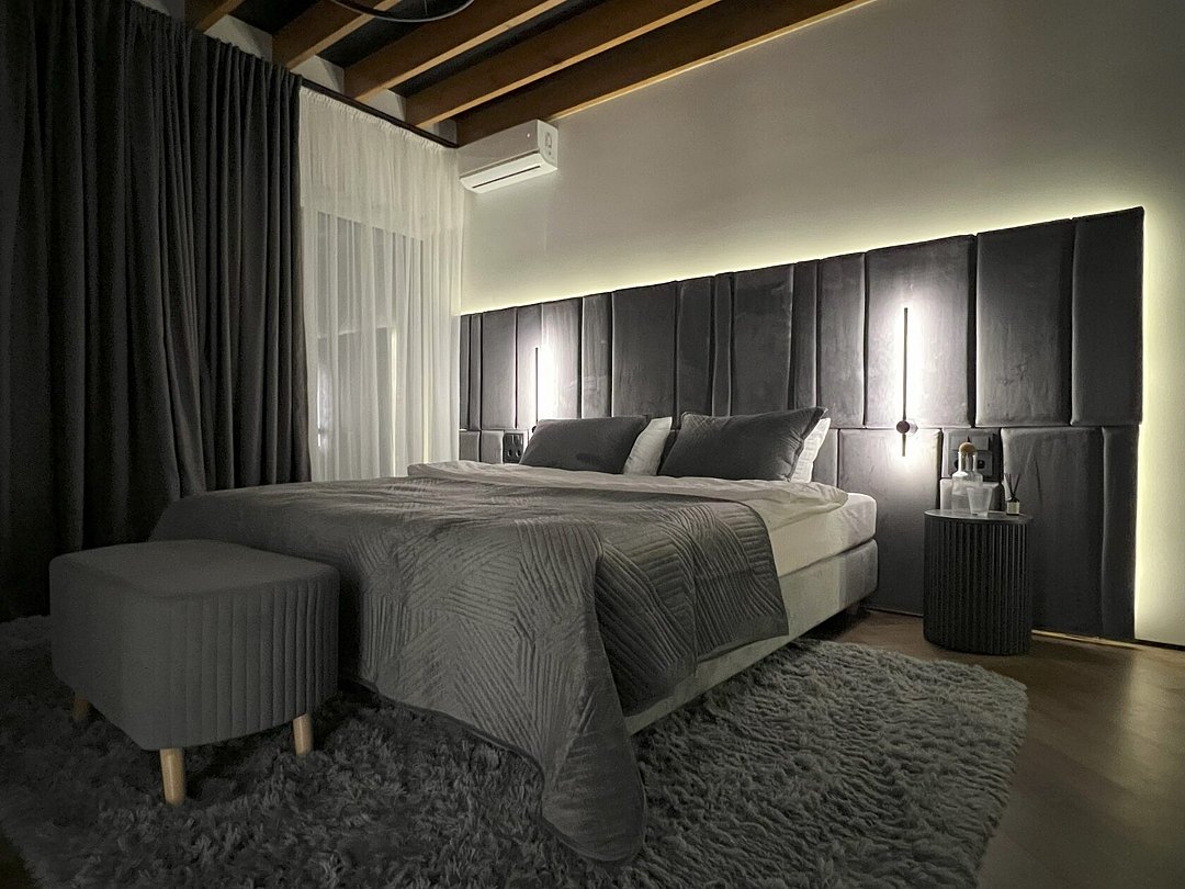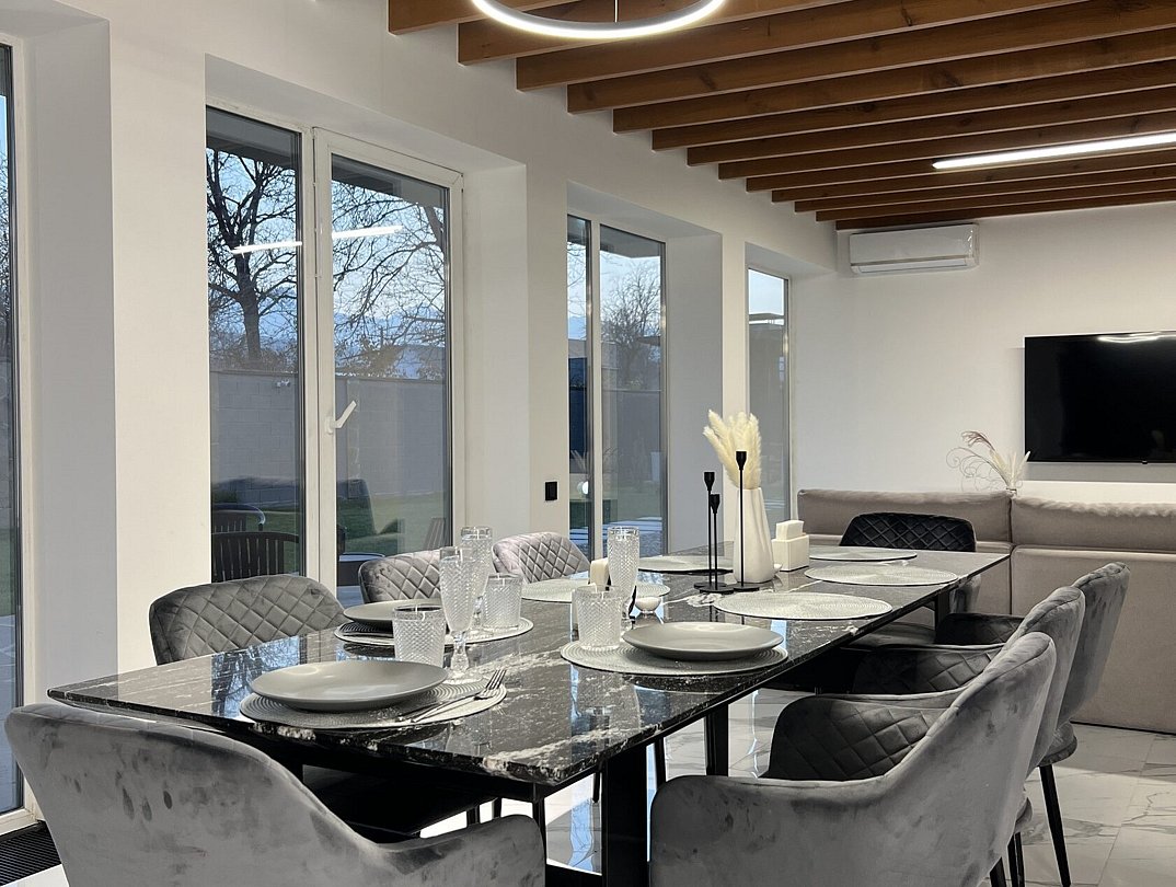 Гости могут остановиться на вилле с современной архитектурой, панорамными окнами, зеленым внутренним двором и уединенной атмосферой для полноценного отдыха 6-7 человек. Внутри предусмотрены 2 спальни с большими кроватями, выходами на балкон, с которого открывается красивый вид на горы. В гостиной стоит большой мягкий диван с двумя дополнительными спальными местами и телевизор со SMART TV. Также на вилле есть отдельные санузлы со стиральной машиной с сушкой и оснащенная кухня со всей необходимой техникой и набором посуды.