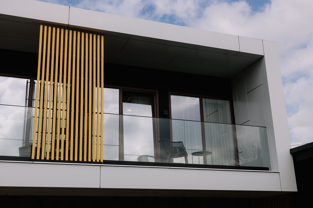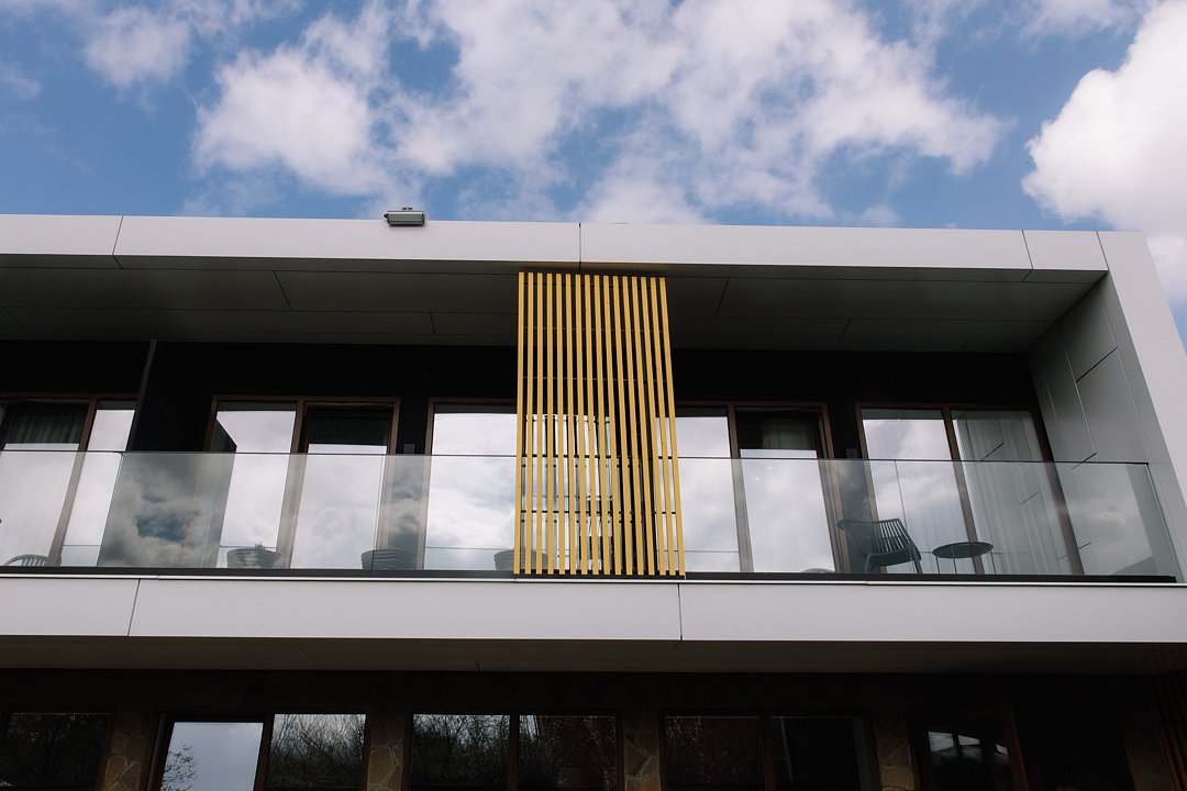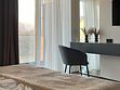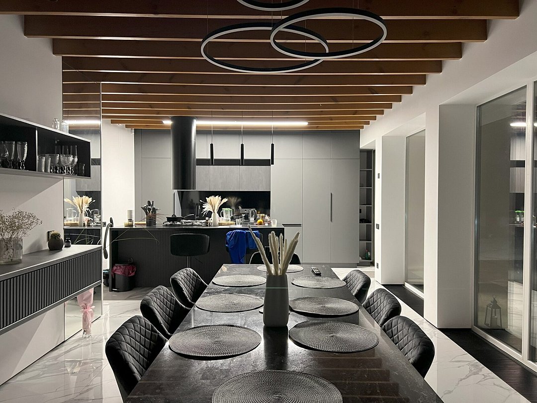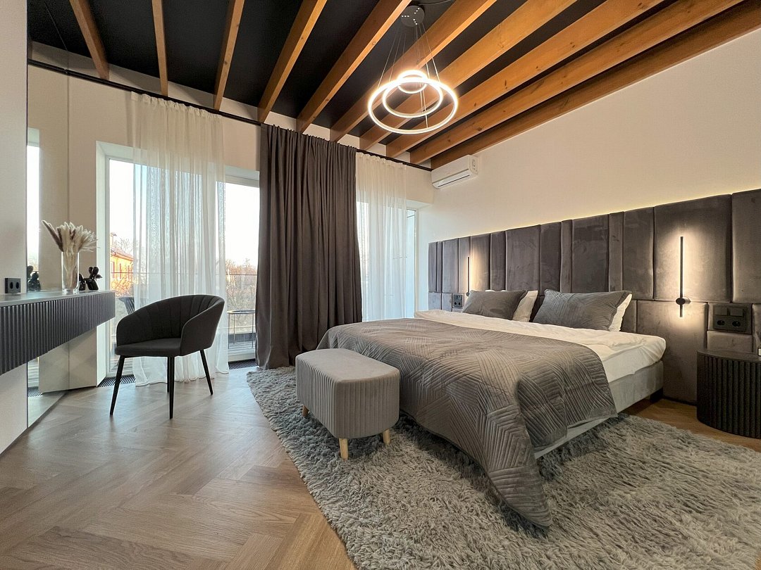 Гости могут остановиться на вилле с современной архитектурой, панорамными окнами, зеленым внутренним двором и уединенной атмосферой для полноценного отдыха 6-7 человек. Внутри предусмотрены 2 спальни с большими кроватями, выходами на балкон, с которого открывается красивый вид на горы. В гостиной стоит большой мягкий диван с двумя дополнительными спальными местами и телевизор со SMART TV. Также на вилле есть отдельные санузлы со стиральной машиной с сушкой и оснащенная кухня со всей необходимой техникой и набором посуды.