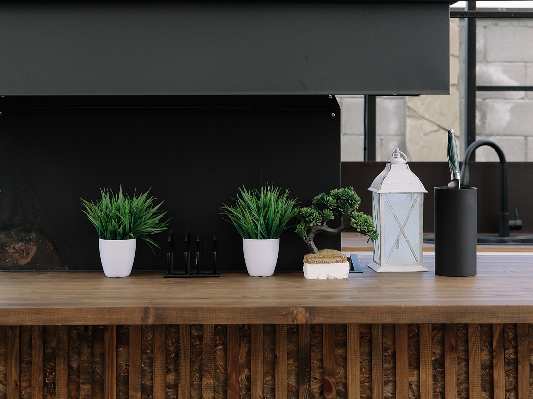 У дома есть терраса с подсветкой и видом на зелень, а с обратной стороны –– патио с зоной барбекю, столовой и зоной отдыха с костром, диваном.