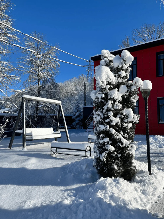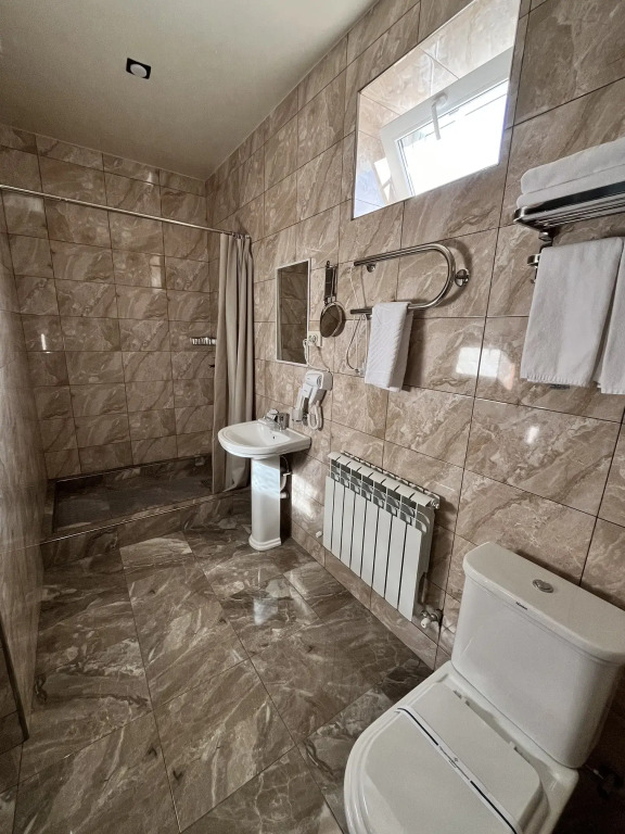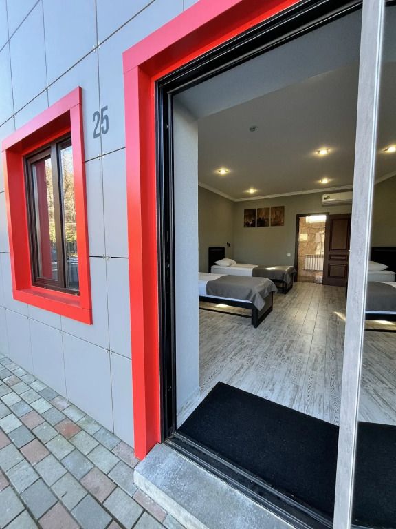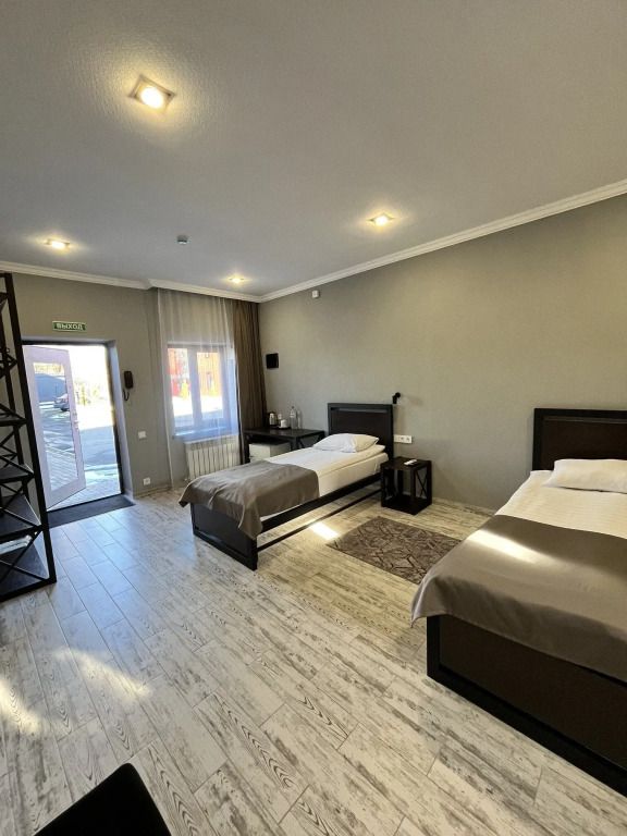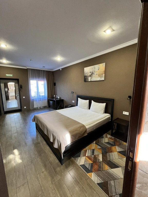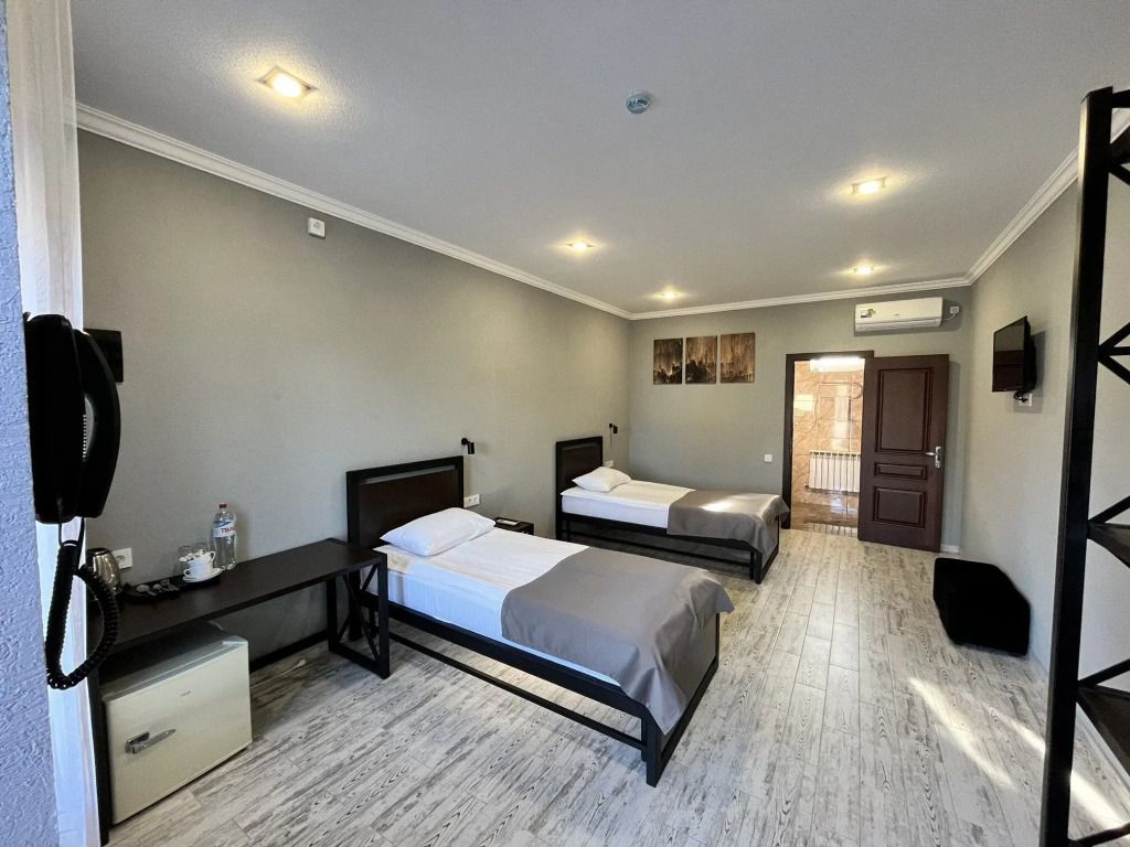 Путешествие с семьейХорошее соотношение цена-качествоОтель расположен в районе частного сектора, но недалеко от центра, тихо, спокойно, огороженная территория. В номерах чисто, есть чайник, холодильник, бутылка воды 1,5 л, чай, вот кофе нет. Разовые тапочки. В ванной комнате набор с зубными щетками и пастой, мыло, шампунь и гель для душа в разовых пакетиках. Не очень удобная душевая кабина, полуоткрыта и вода заливает пол в ванной во время мытья. Номера чистые, постель удобная. Девушки на рецепшне приятные, внимательные, быстро заселили, «устроили» наш чемодан после выселения. Можно заказать завтрак на месте. Так как мы останавливались на одну ночь по дороге в Грузию, и через неделю снова на одну ночь, то завтрак заказали во вторую остановку - столовая в отдельном корпусе, надо пройти по улице на территории гостиницы, вот тут мне не очень понравилось, прохладно в октябре в помещении, смурная, уставшая женщина вынесла, заказанные нами с вечера, блюда и ушла заниматься своим делами, от которых как нам показалось мы ее оторвали. На небольшом общем столе отдельно лежали хлеб, сыр, джем, что-то ещё, что входило в стоимость завтрака, но этого было так мало, что даже неудобно было забирать последние кусочки))) а пополнится это или нет, спрашивать не очень хотелось. Ну может просто день у человека не задался или самочувствие не очень было, мы же только один раз завтракали, но если в столовой всегда так встречают, это не очень приятно.