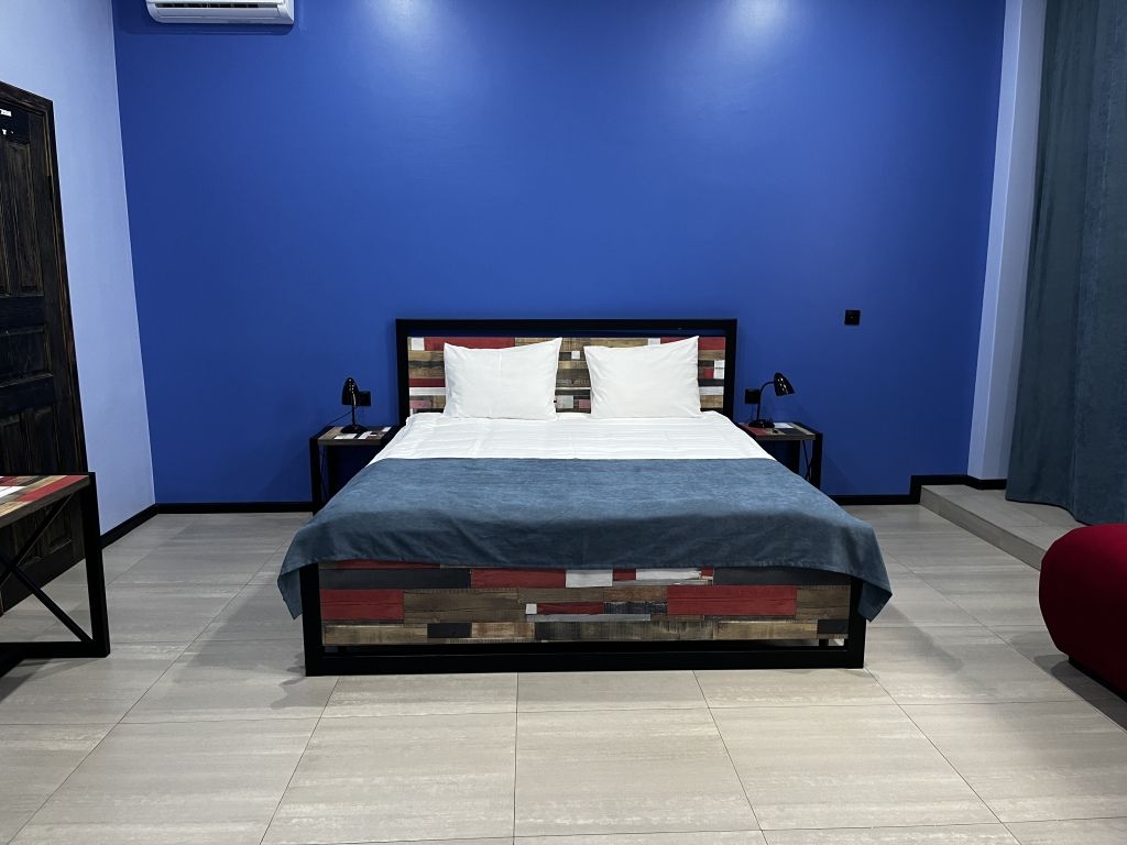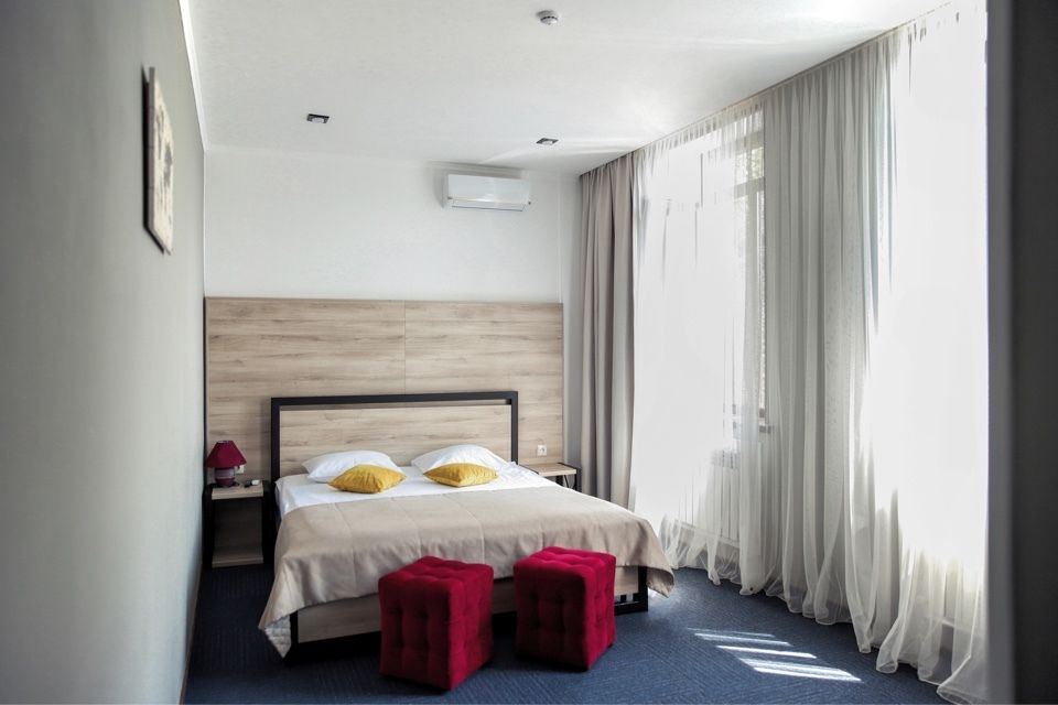 телевизор, Wi-Fi, кондиционер, светильник, фен, банные принадлежности, тапочки, гигиенические средства, двуспальная кровать, шкаф для одежды, вешалки, журнальный столик, зеркало, комод, пуфики, чайный набор, набор посуды, чайник, унитаз, раковина, питьевая вода, ковровое покрытие, отопление, душ, вид во двор, высокие потолки, стаканы, столовые приборы, туалет, сплит-система, мини-холодильник, номер для некурящих, уборка номера, бутилированная вода, мыло, без питомцевВ гостиничном номере