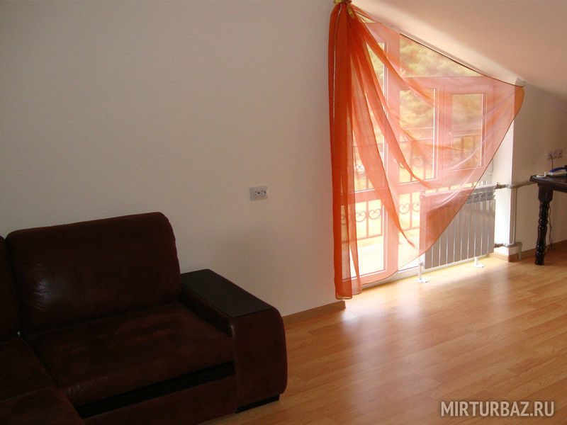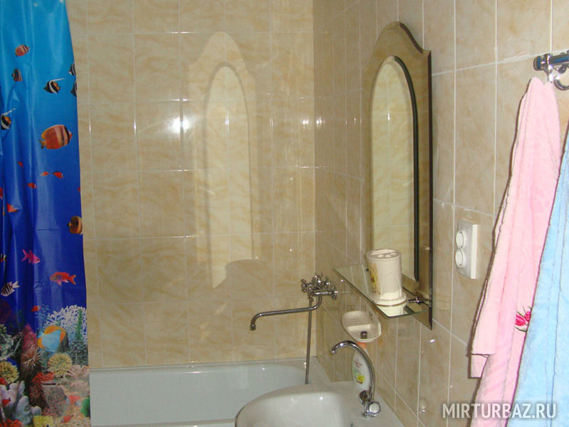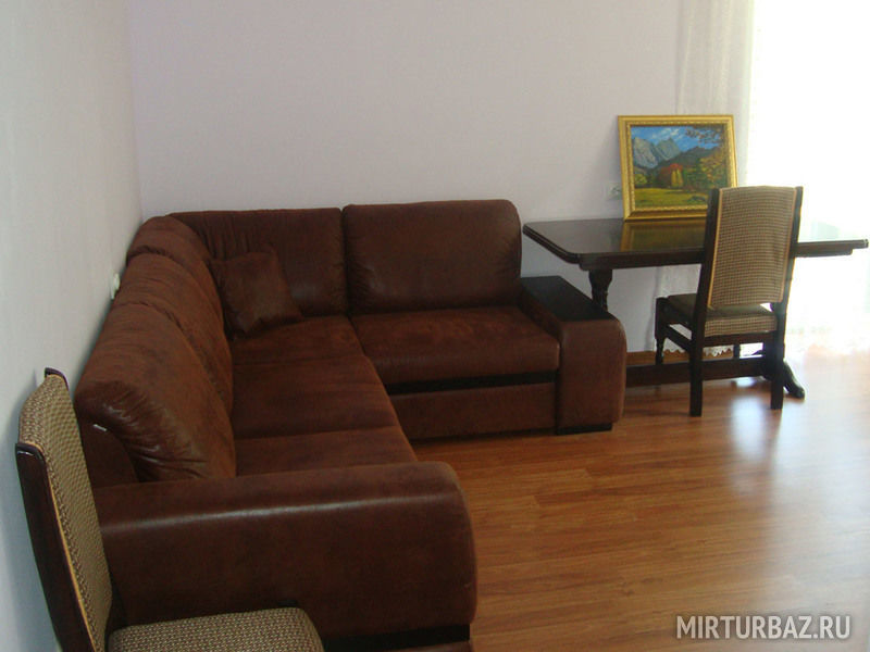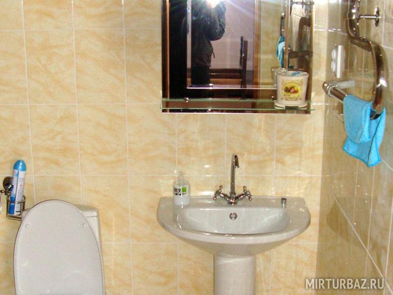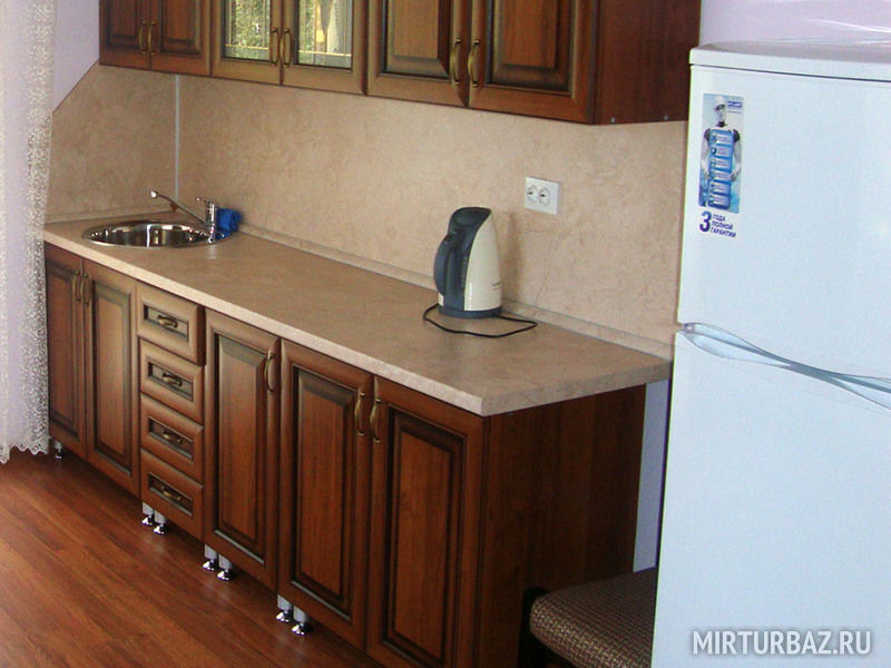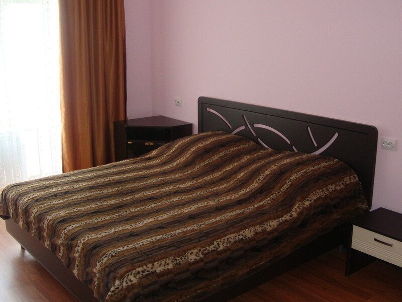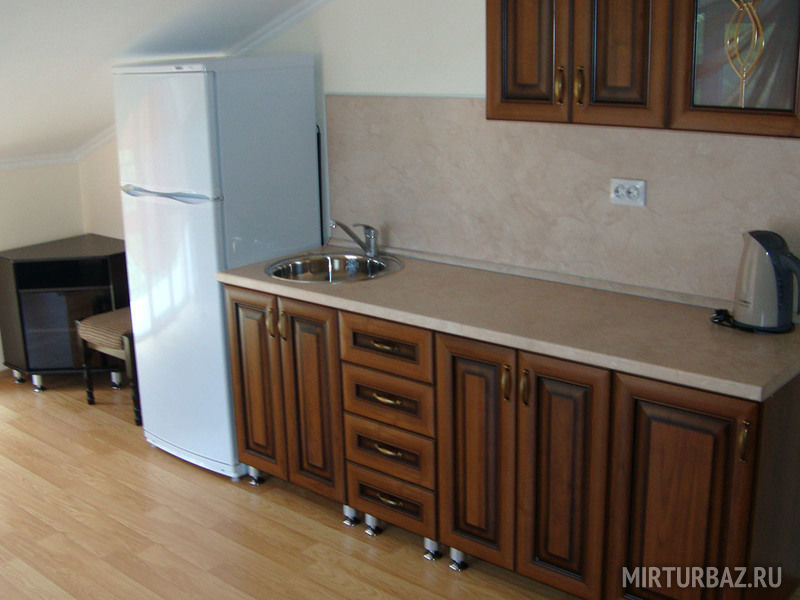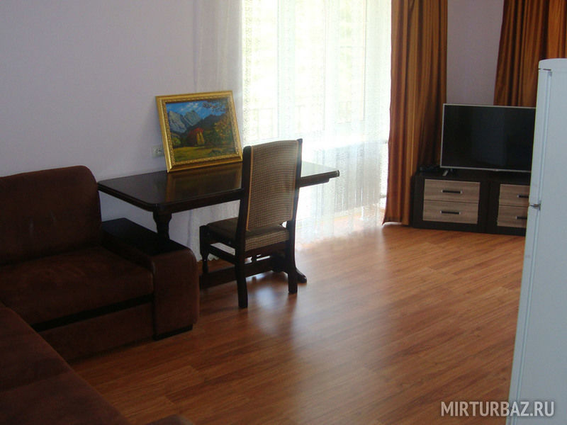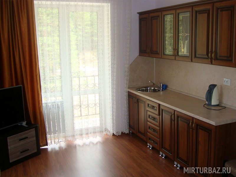 В номере двуспальная кровать, диван, телевизор, мини-кухня с раковиной, холодильник, электрический чайник, собственный санузел с туалетом и ванной.