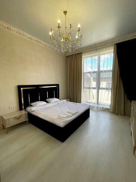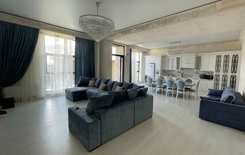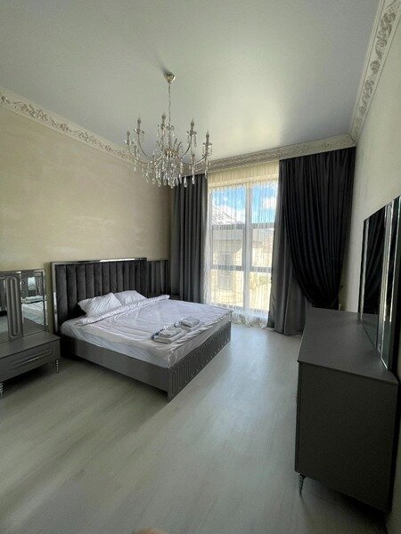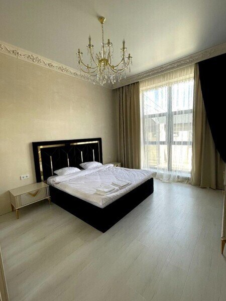 На первом этаже уютного коттеджа расположены огромная кухня с обеденной зоной и уютная гостиная, три спальни с захватывающим видом на горы, а также два санузла. Во внутреннем дворе есть качели, зоны для барбекю с мангалом и столами для 12 человек, а также уютная лаунж-зона с уличными диванами, подвесными креслами и уличным камином. Это идеальное место для отдыха в компании друзей, где можно расслабиться и провести время в атмосфере уюта и спокойствия.