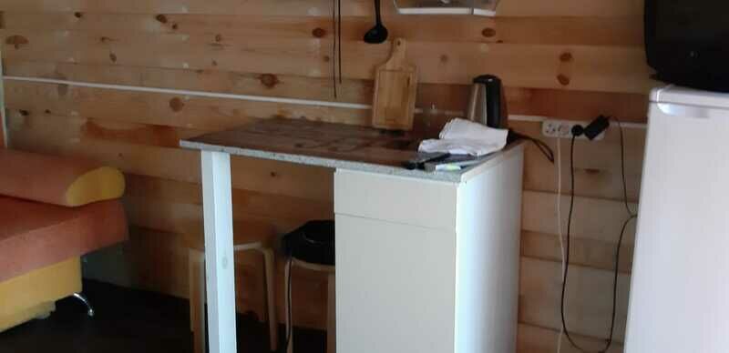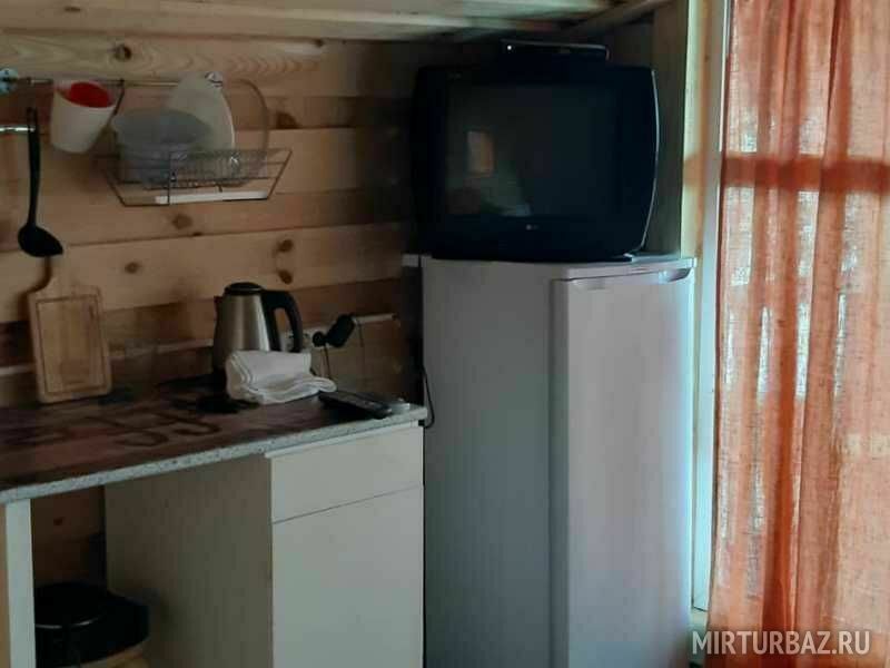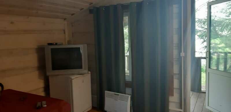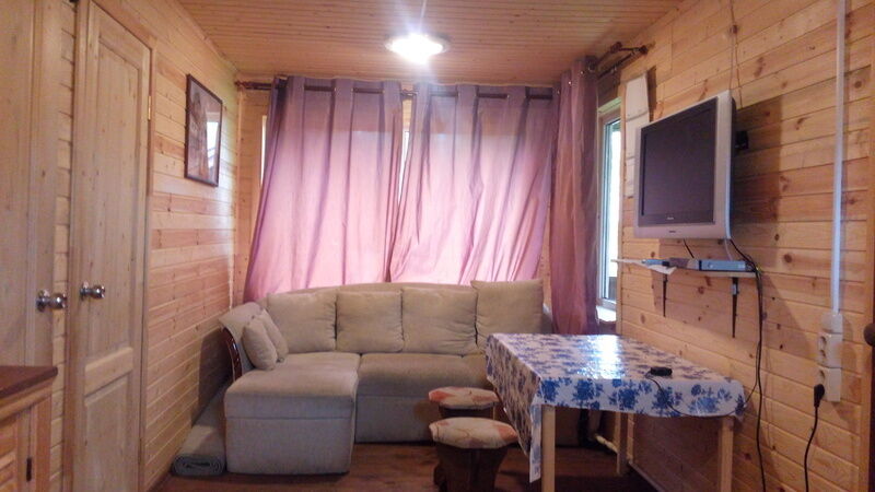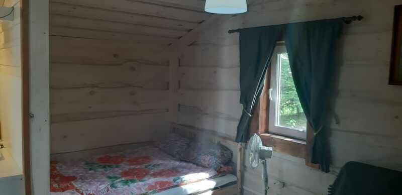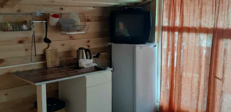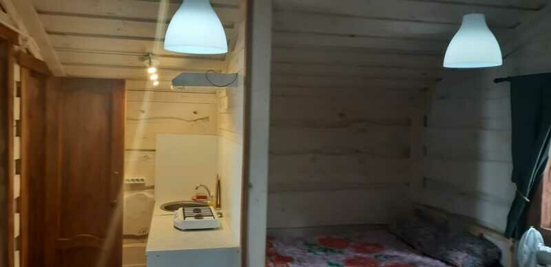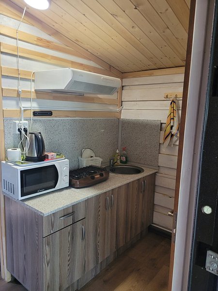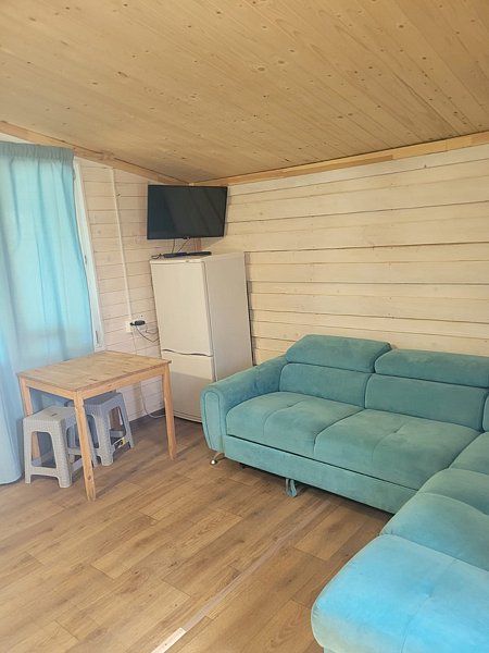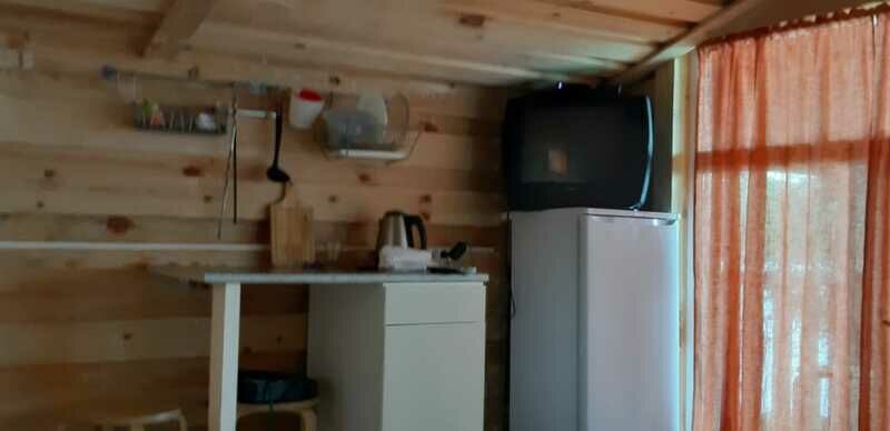 Дом студия с двуспальной кроватью и раскладным диваном. Есть кухонная зона с холодильником, микроволновкой и электрическим чайником.С/у в доме. Веранда с мангальной зоной.