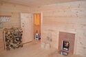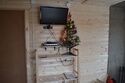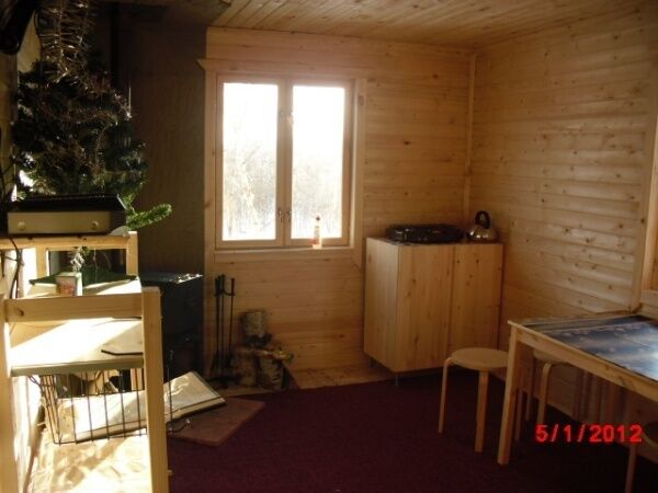 1 этаж: уютная гостиная: раскладной диван (2-х спальный), телевизор, DVD проигрыватель, караоке, музыкальный центр, оборудованная мини-кухня (вся необходимая кухонная и столовая посуда: тарелки, кружки, вилки, ложки, ножи, стаканы, рюмки, фужеры, кастрюли, сковородка), холодильник, газовая плита, обеденный стол, табуреты, печь-камин (коттедж отапливается дровами). Спальня с 2-мя раздельными кроватями. С/у: умывальник и туалет.
