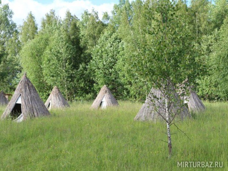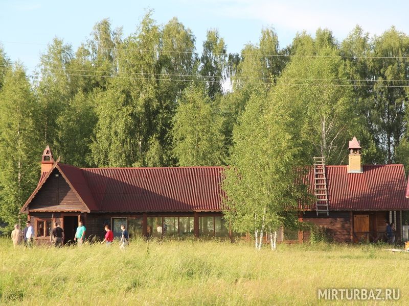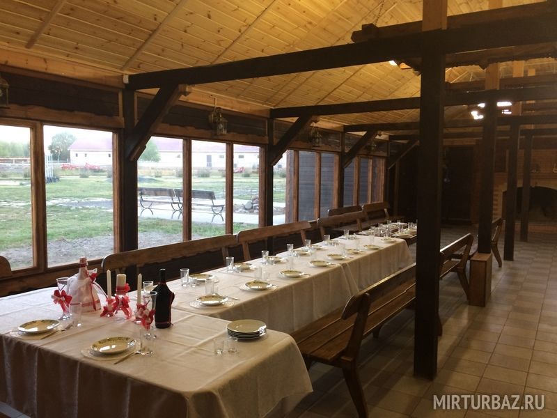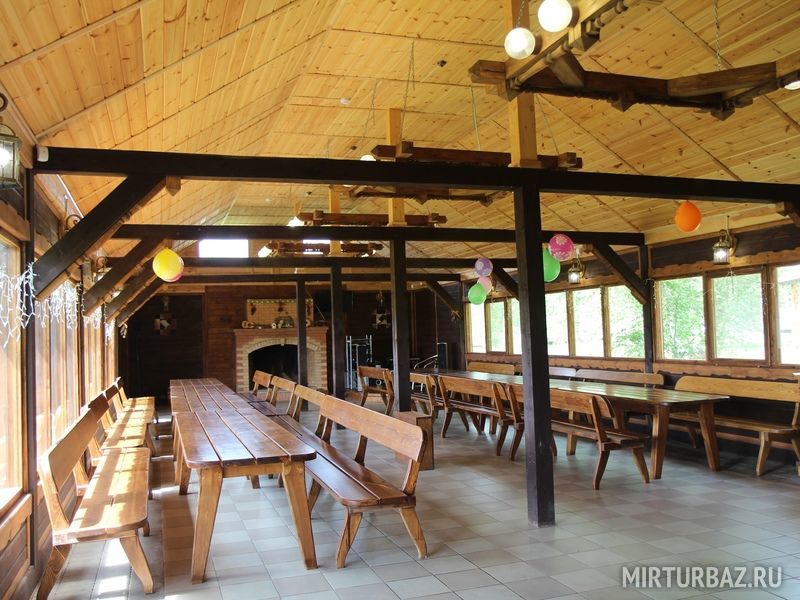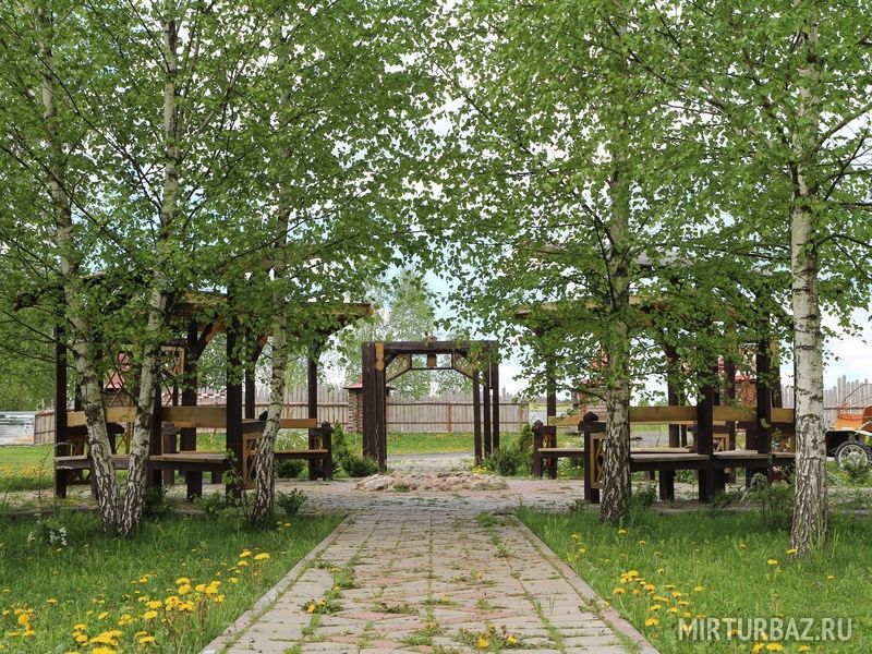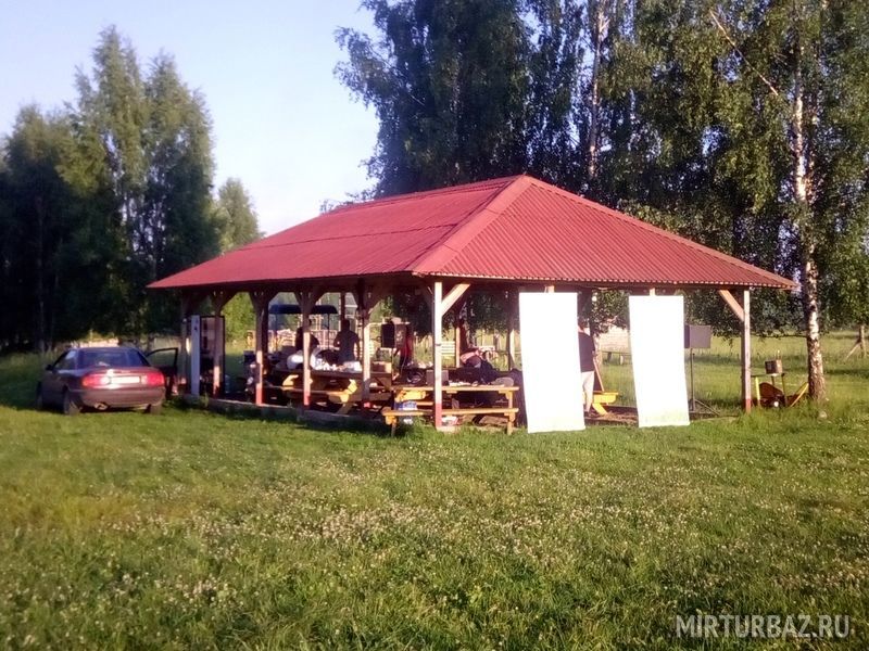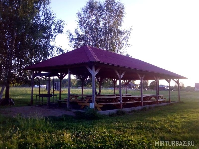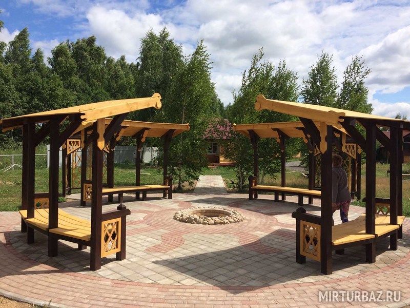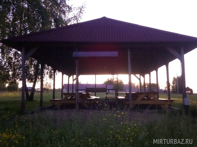 Оно оборудовано красиво выложенным кострищем и четыре большие скамейками с крышами.Большая беседка для 60 гостей