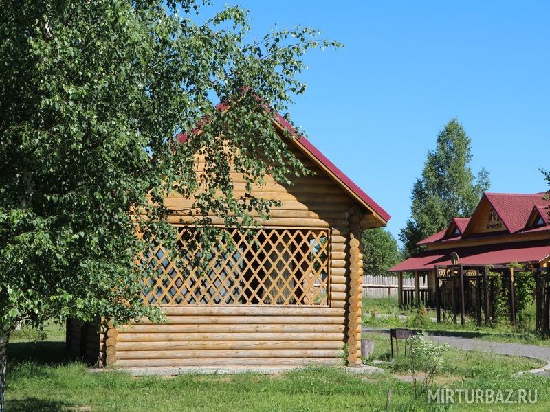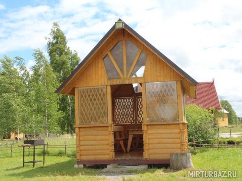 Уютная беседка рядом с маленьким прудом. Есть свет, розетки. В комплекте также мангал и пять шампуров.