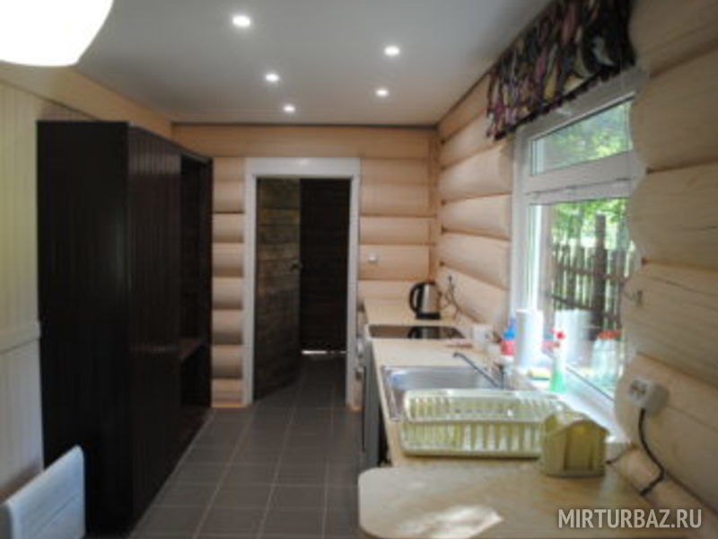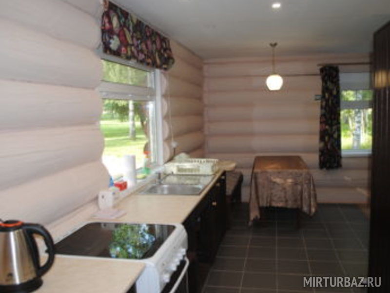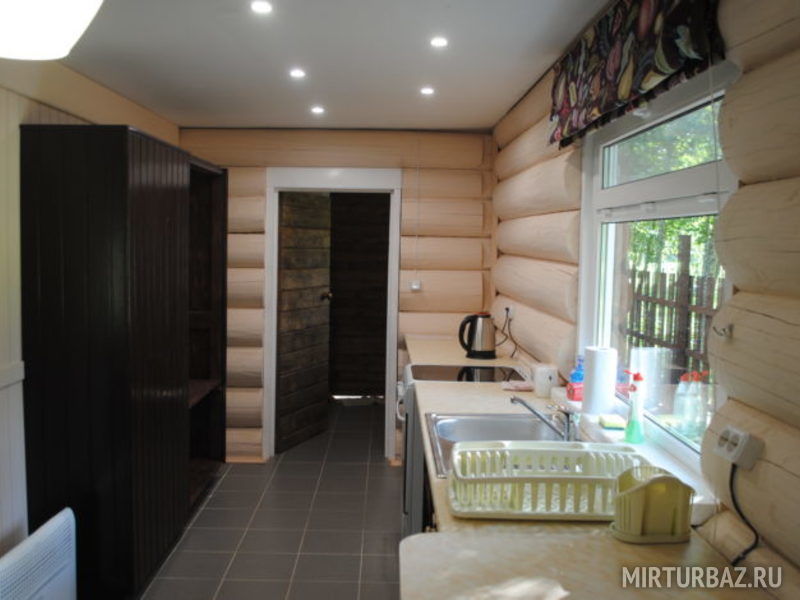 В доме есть 1 спальня, гостиная с кухней. Коттедж в традиционно русском стиле расчитан на семейную пару или семью с ребенком. В доме есть холодильник, электроплита и вся необходимая посуда. Горячая и холодная вода на кухне и в ванной. Площадь коттеджа составляет 48 кв. метров.