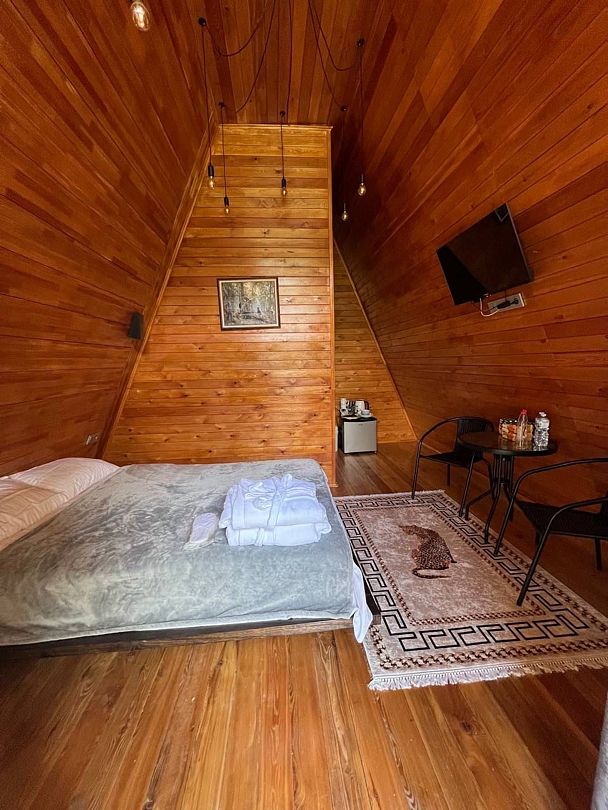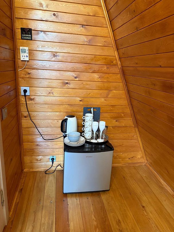 Внутри дома: одна комната, двуспальная кровать, столик, два стула, холодильник, чайник, посуда, приборы, ТВ, Wi-Fi. Душевая, совмещенная с санузлом.