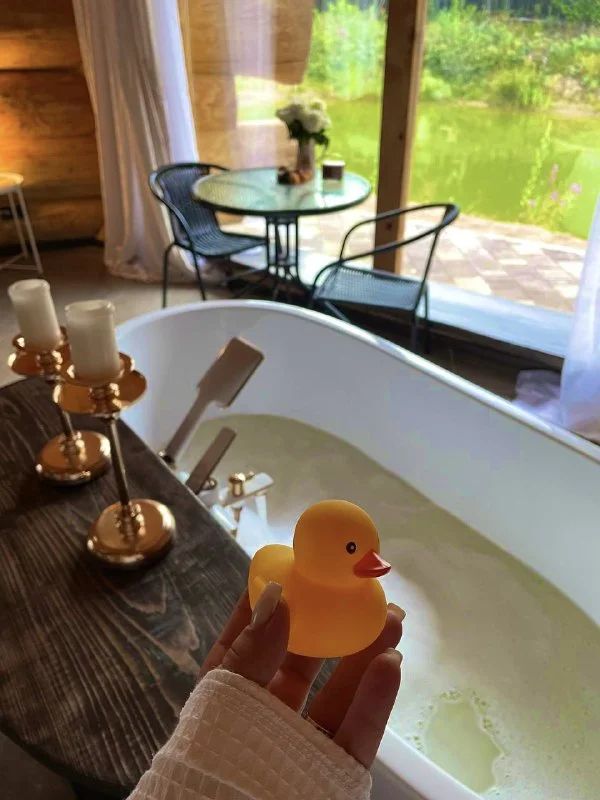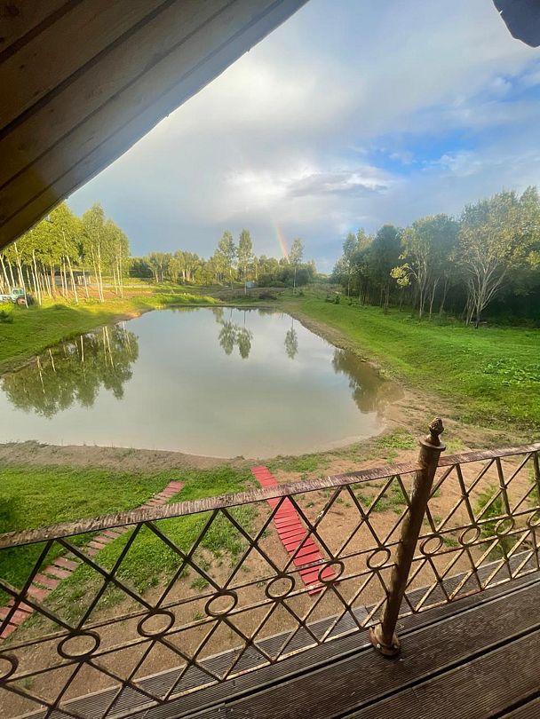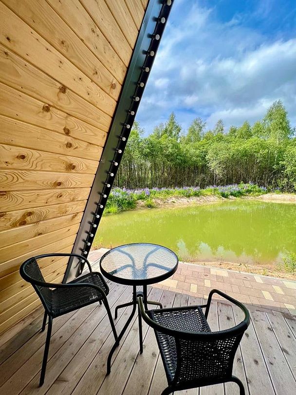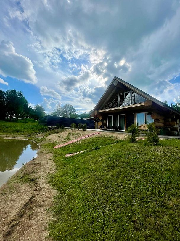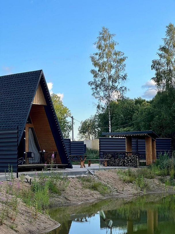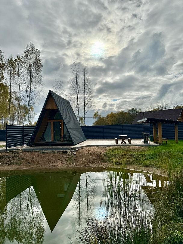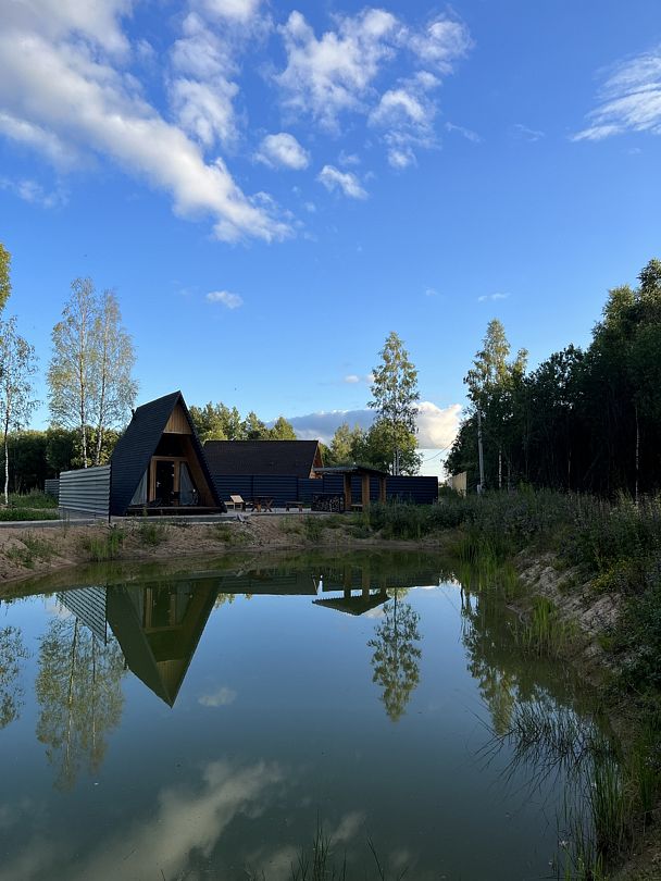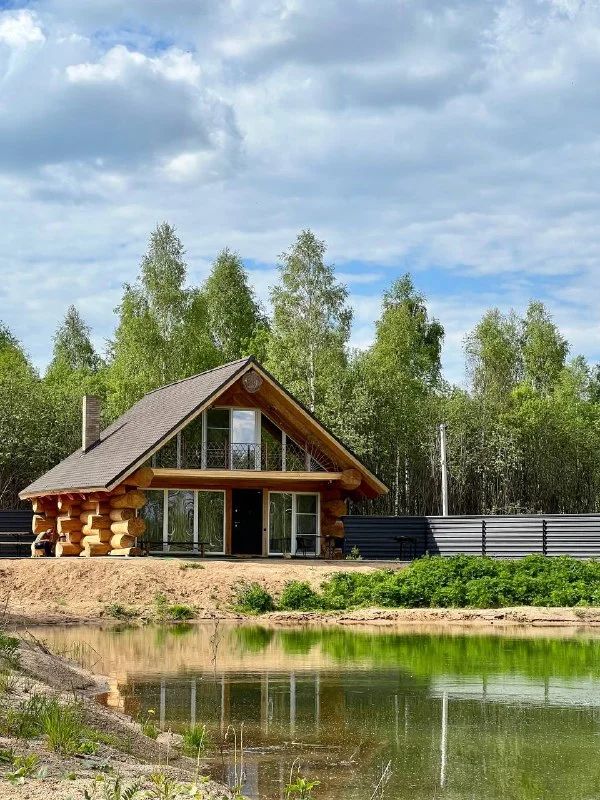Уютный дом для двоих на берегу пруда с панорамным видом, идеален для романтического отдыха на природе.