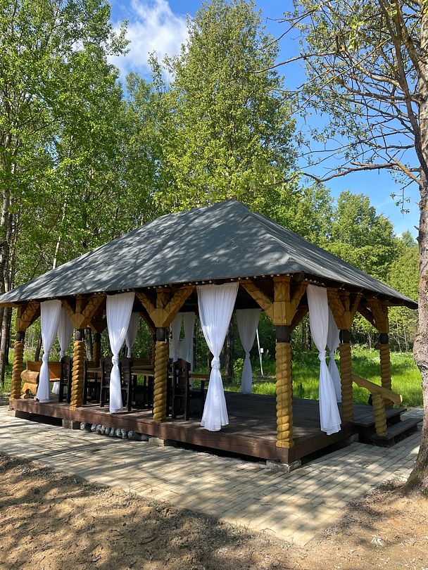 Беседка открытого типа, подойдет как для небольшой компании, так и для компании до 25 человек. Вокруг беседки территория из брусчатки, есть место для установки звукового и прочего оборудования, и, конечно же, для танцев. Рядом с беседкой расположена зона для барбекю с мангалом, рабочей поверхностью и раковиной — удобно вымыть и нарезать продукты. Шампура, решетку, уголь и розжиг предоставляются за дополнительную плату.