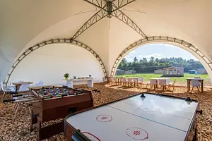 Для гостей подготовлены идеальные условия отдыха в любой компании. Номера различных категорий оборудованы всем необходимым для комфортного пребывания. Доступно качественное питание из местных продуктов. На территории находятся бани, фермерский магазин, работает прокат инвентаря. Гордость комплекса — уникальная костровая зона для приготовления еды и шатёр с развлечениями: настольные игры, PS5, киносеансы. Для удобства отдыхающих предусмотрена бесплатная охраняемая парковка.