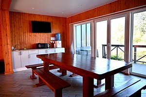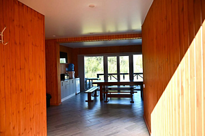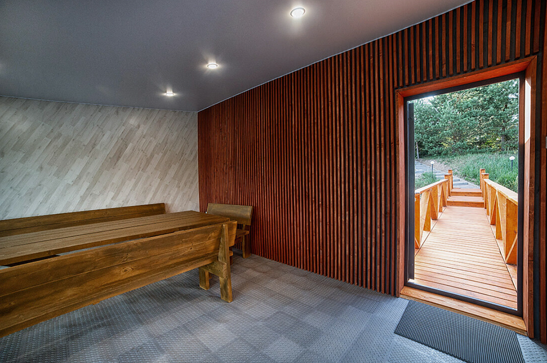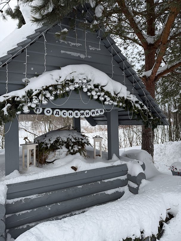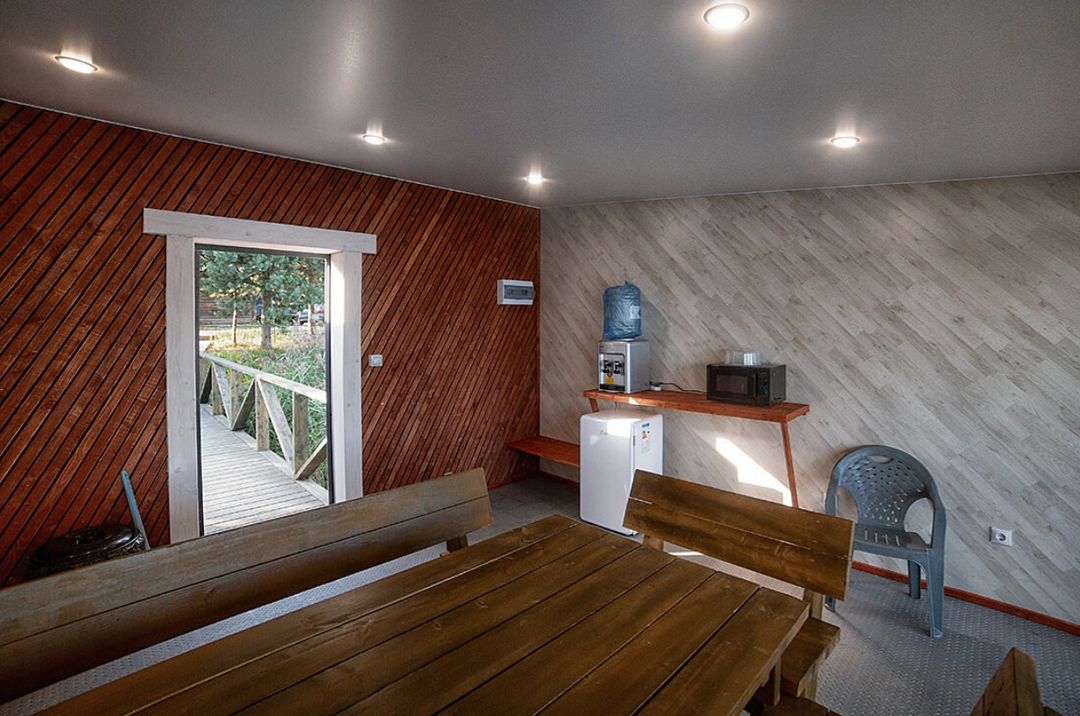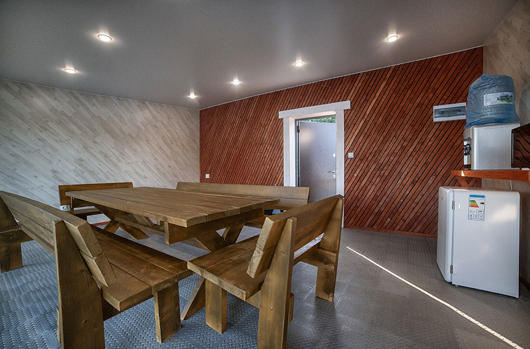 Закрытые отапливаемые беседки, рассчитаны на 12-15 человек. Внутри расположен большой стол, холодильник, СВЧ, кулер с питьевой водой, ТВ, кондиционер. На территории есть детская площадка.